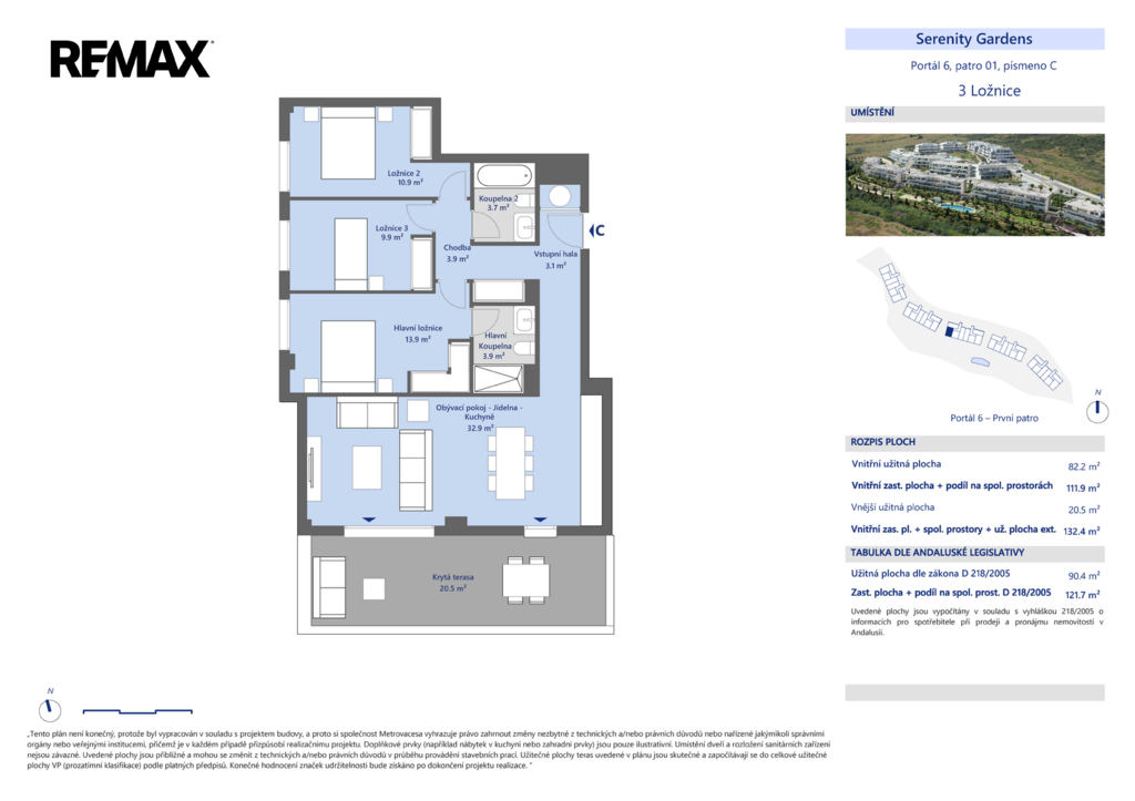 ✔ Apartmán: má rozlohu 82,2 m2 a přísluší k němu krytá terasa o velikosti 20,5 m2