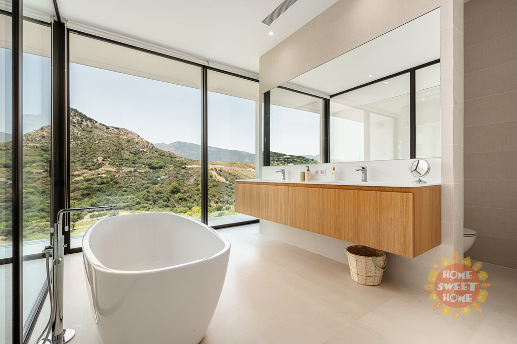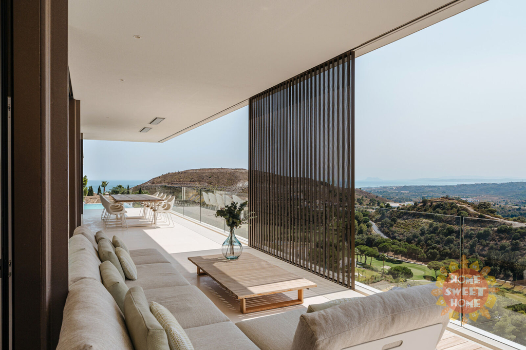 Tato moderní vila stojí na velkém pozemku o rozloze 5 388 m² a nabízí obytnou plochu 352 m² a terasu o rozloze 185 m². Může se pochlubit nádherným výhledem na moře, hory a golfové hřiště. Vila má 3 stylové ložnice s vlastními koupelnami, útulný obývací pokoj s krbem a minimalistickou kuchyň se špičkovými spotřebiči. Prostorná terasa je ideální pro stolování pod širým nebem a relaxaci.
