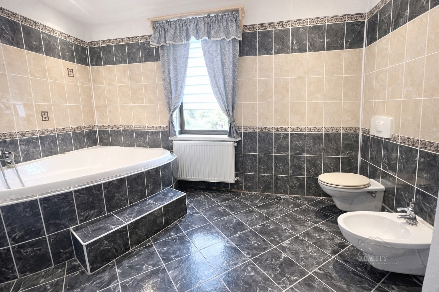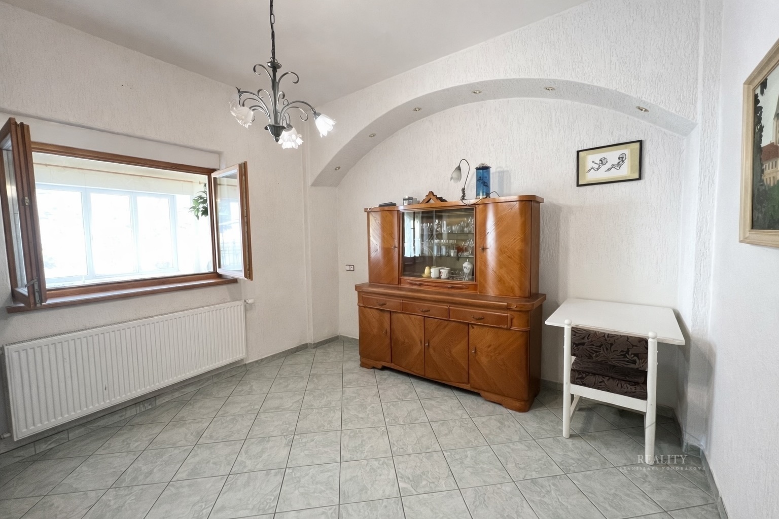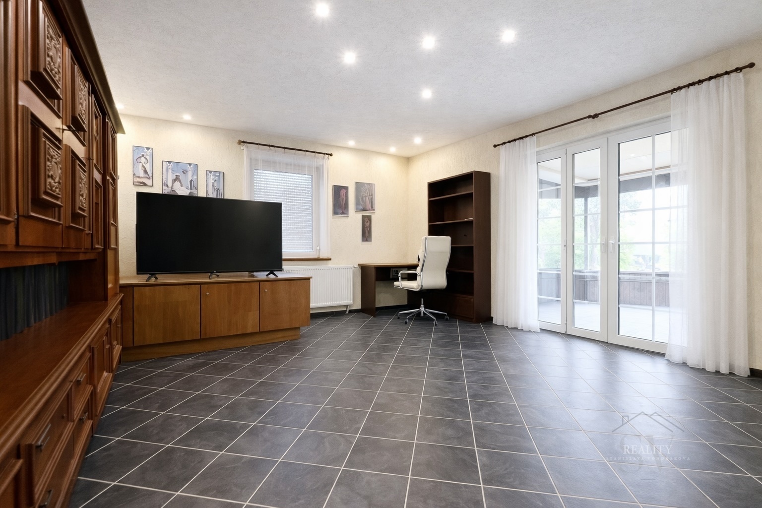 Suterén nabízí velkou společenskou místnost (43 m²), zázemí s kuchyňkou a sociálním zařízením, kotelnu/technickou místnost, sklípek, chodbu a schodiště. Tento prostor je ideální pro rodinné oslavy, hobby zázemí nebo případné samostatné využití.