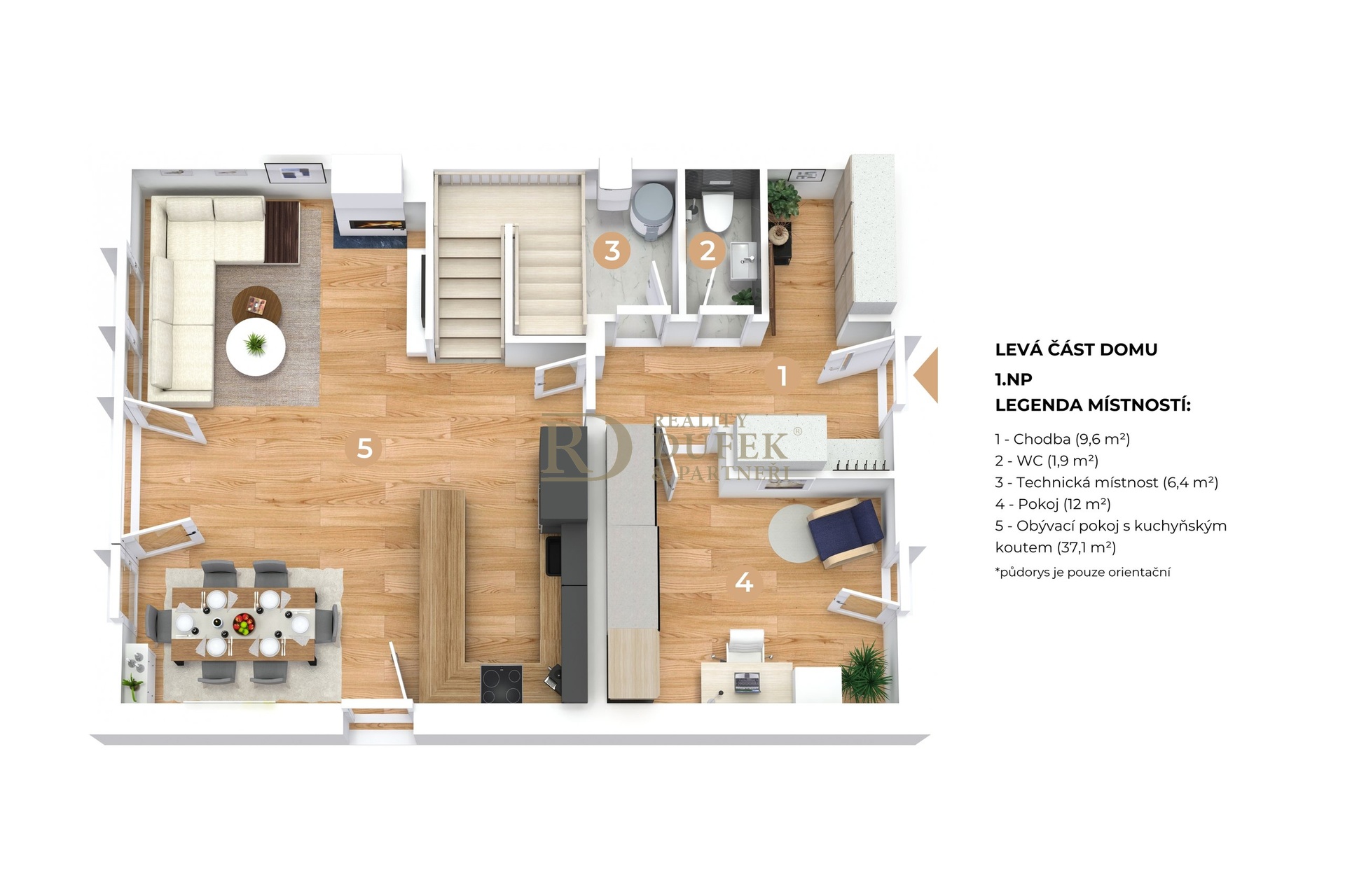 • Přízemí: otevřený obývací prostor s přípravou na kuchyň, pokoj pro hosty/ pracovnu, koupelna a technické zázemí.