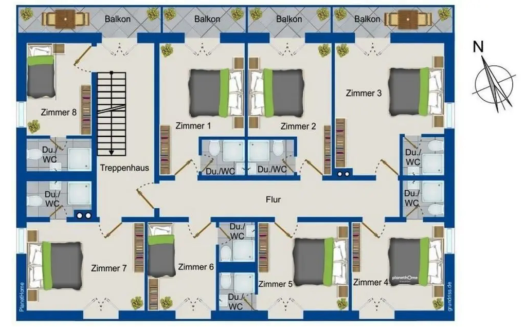 V 1. patře je 8 pokojů. 6 dvoulůžkových a 2 jednolůžkové pokoje jsou vybaveny sprchou a WC. Polovina kvalitně zrekonstruovaných pokojů má balkon a druhá polovina má terasu před pokoji.