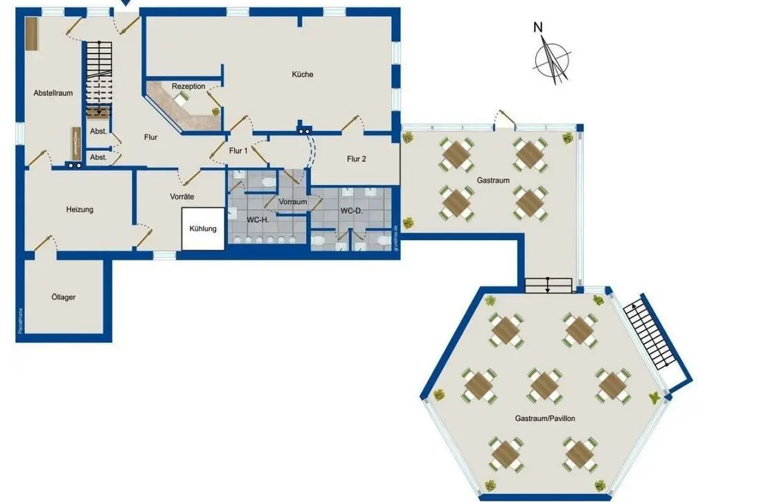 Pavilon je podsklepený. Pravá čas a slouží pro restauraci. Chladicí Box na pivo a nápoje, chlazeni pro lednice a sklad. V levé časti je sklad a místnost s pračkou a sušičkou.