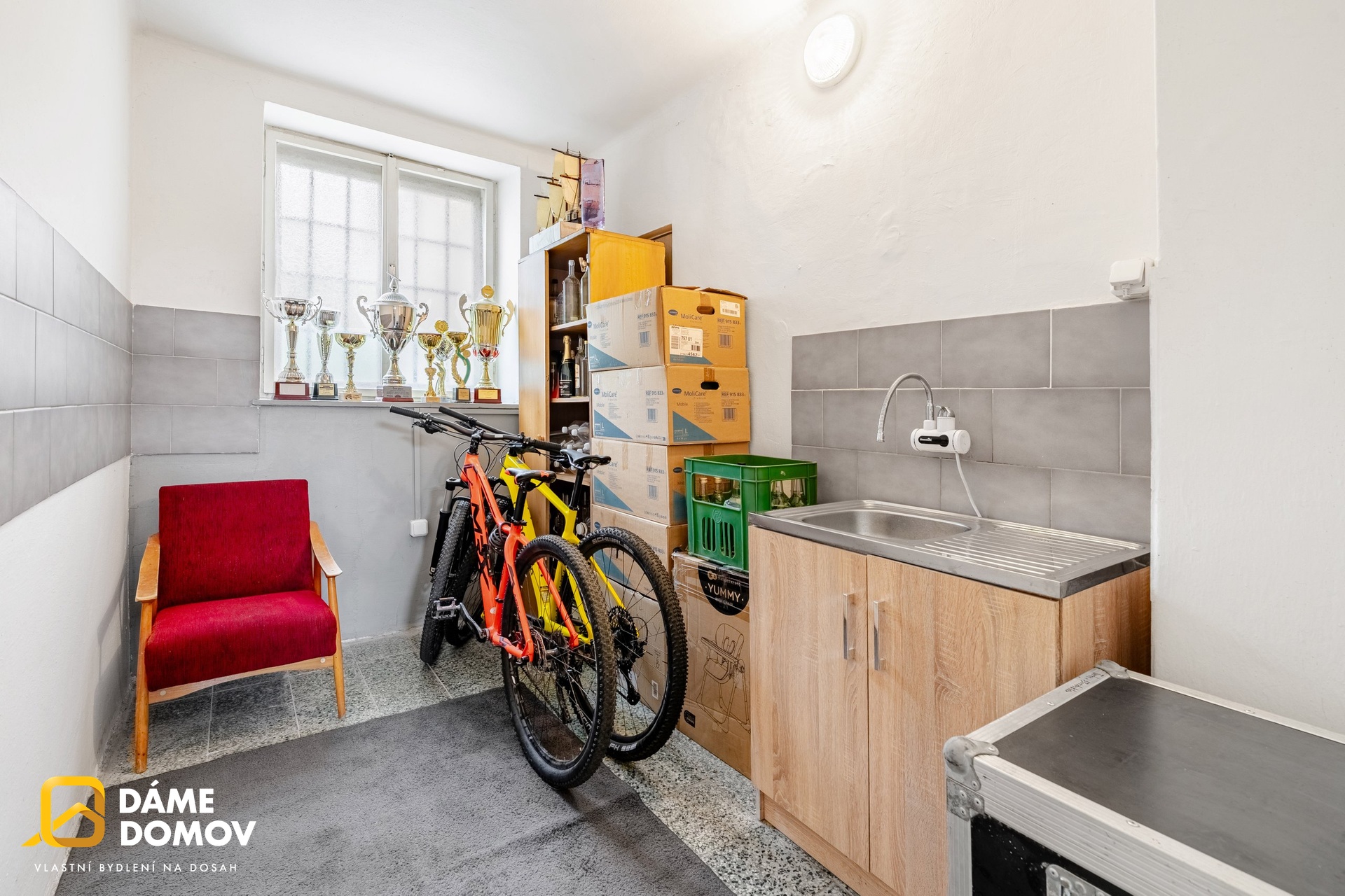 Nemovitost je v dobrém technickém stavu a je napojena na elektřinu, obecní vodovod i kanalizaci. Dominantou je hlavní místnost – „sál“ – s vjezdem přes elektricky ovládaná vrata kde uskladníte až 15 aut nebo mnoho motocyklů. Dále je zde kancelář, kuchyňka, sociální zázemí (toalety, sprcha) a sklep. Bočním průchodem se dostanete na zadní dvorek, včetně úložného prostoru a vstupu na půdu, která nabízí možnost rozšíření obytné či užitné části.
