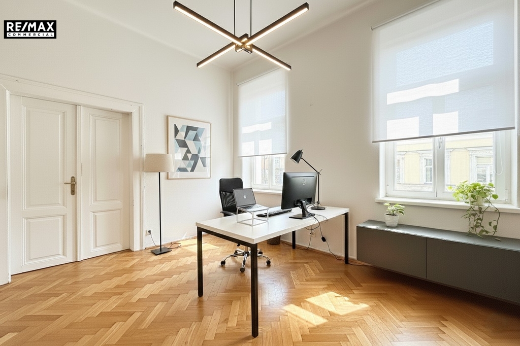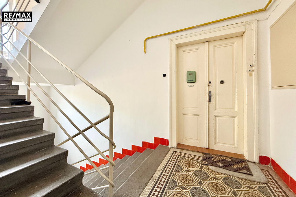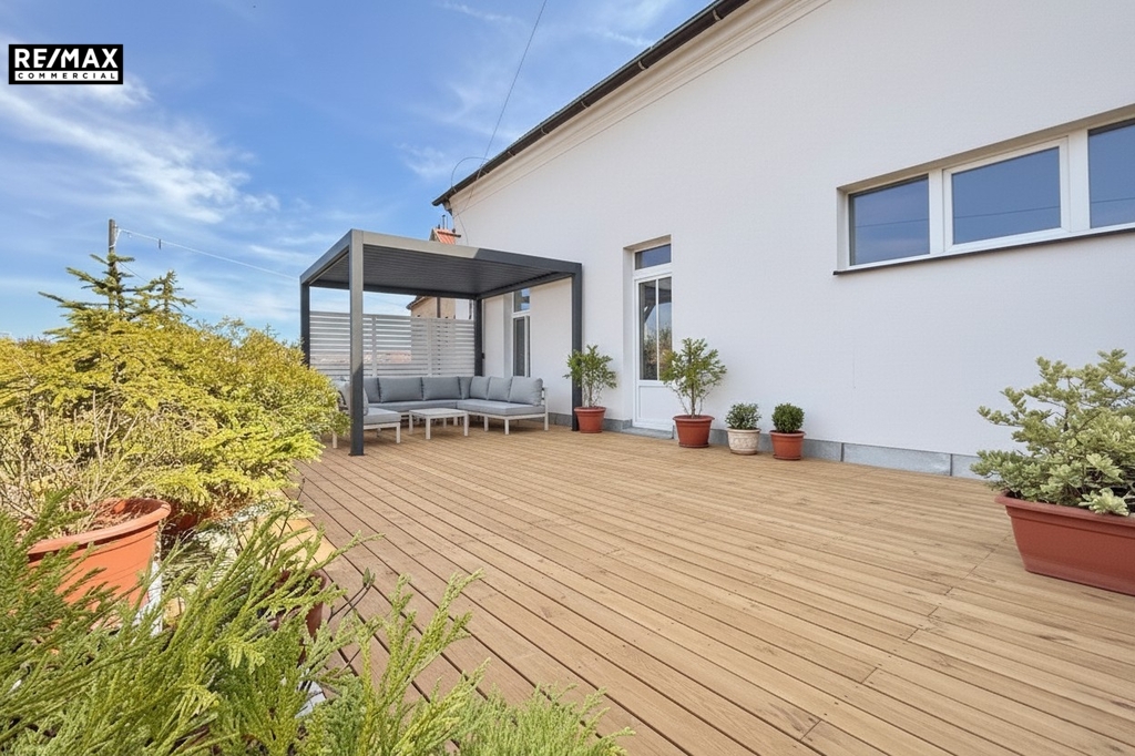 Byt se nachází v prvním patře menšího bytového domu a zaujme především svou terasu o velikosti 43 m², která nabízí dostatek prostoru pro odpočinek, grilování i pěstování zeleně. Díky vysokým stropům (3,5 m) působí celý byt vzdušně a elegantně.