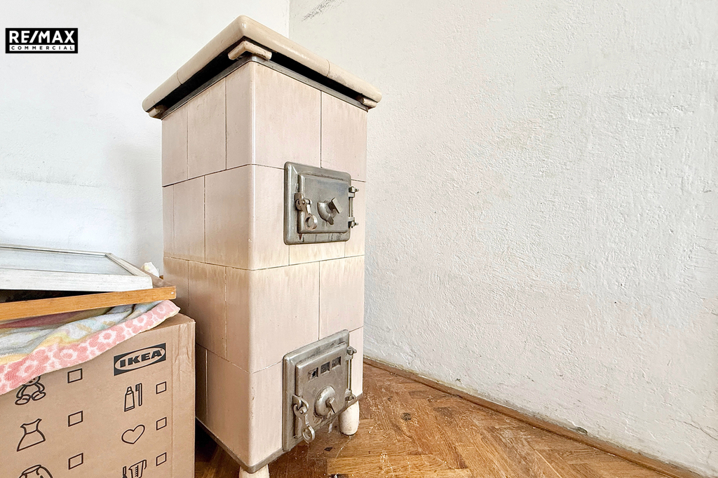 V jednom z pokojů ještě dobová kamna na tuhá paliva. Vytápěno pomocí plynového kotle.