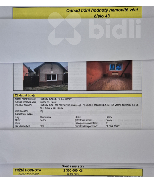 K dispozici je aktuální tržní odhad nemovitosti od znalce, stanovený na 2. 300 000 Kč, který lze využít při žádosti o hypotéku.