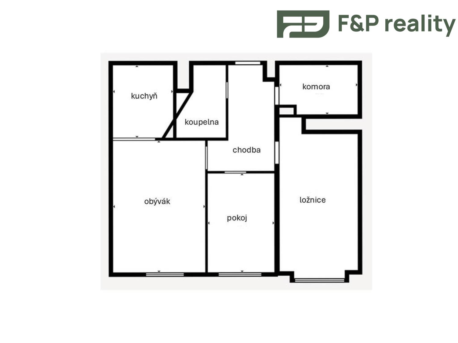 Dispozice bytu: obývací pokoj s kuchyňským koutem, dva samostatné pokoje, komoru vhodnou pro uskladnění popřípadě z ní udělat pracovnu a koupelnu s toaletou. K bytu náleží také sklep 2 m2.