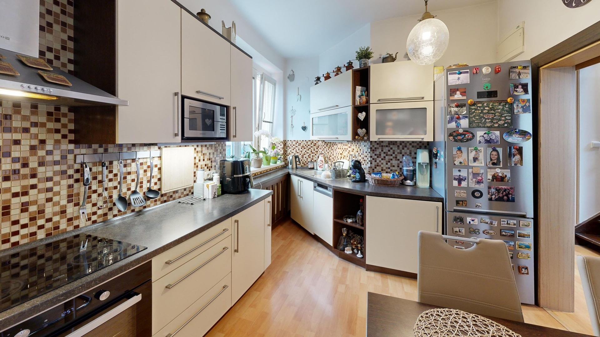 • 1. patro + podkroví (mezonet) – byt 3+1 o celkové výměře 97,5 m², rovněž se společným vstupem.