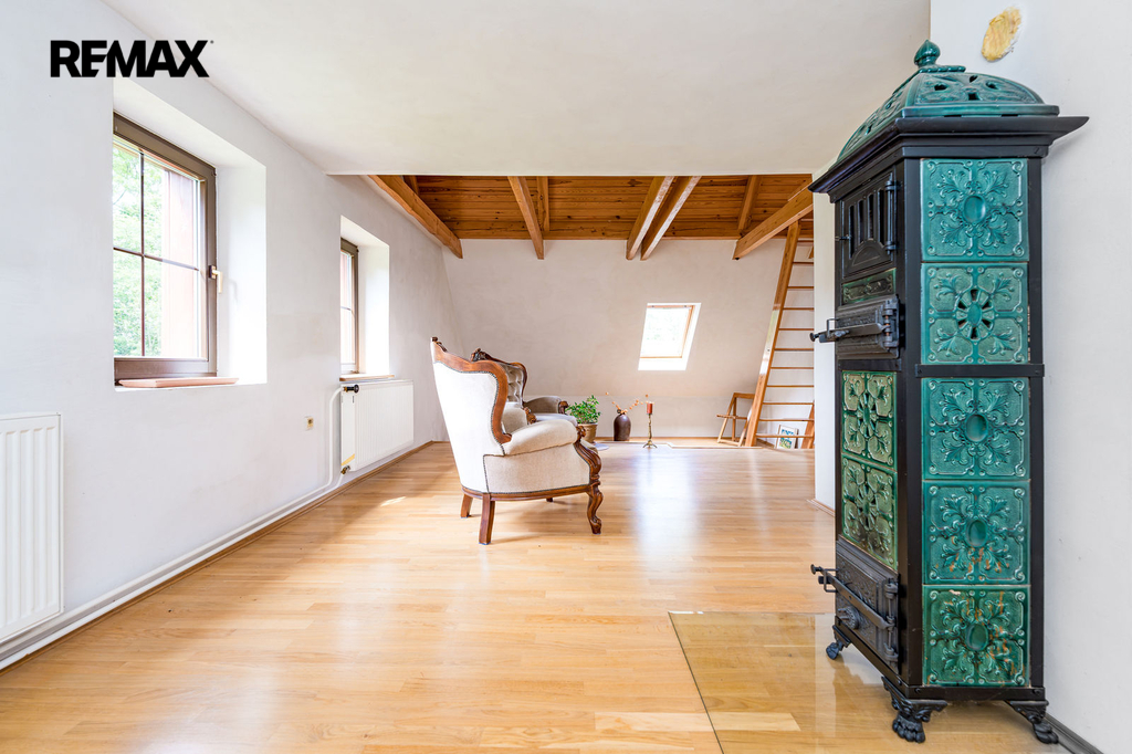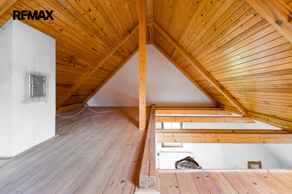 V podkroví se nacházejí tři místnosti s možností využití pro další obytný prostor pod střechou. Vytápění je ústřední pomocí kotle na tuhá paliva a lokálními krbovými kamny v obývacím pokoji. Teplou vodu zajišťuje elektrický bojler. Nemovitost je napojena na elektřinu, vodu z vlastní studny a kanalizace je svedena do septiku.