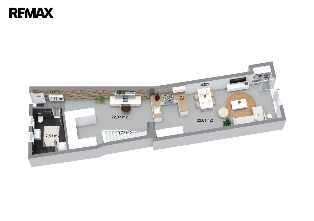 V přízemí šatna, hala se schodištěm, navazuje kuchyň, jídelní kout a obývací pokoj. Odtud vstup na dvorek a sklípek. Zahrada je ve svahu. V horním patře je pak ložnice a WC.