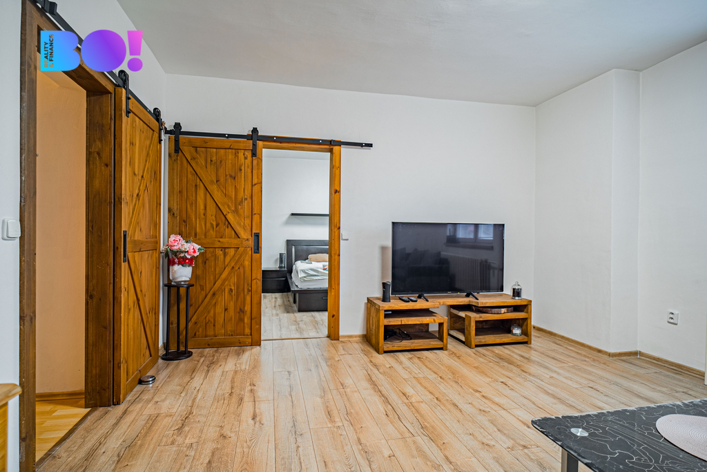 Prostorný a světlý byt s oddělenými místnostmi.