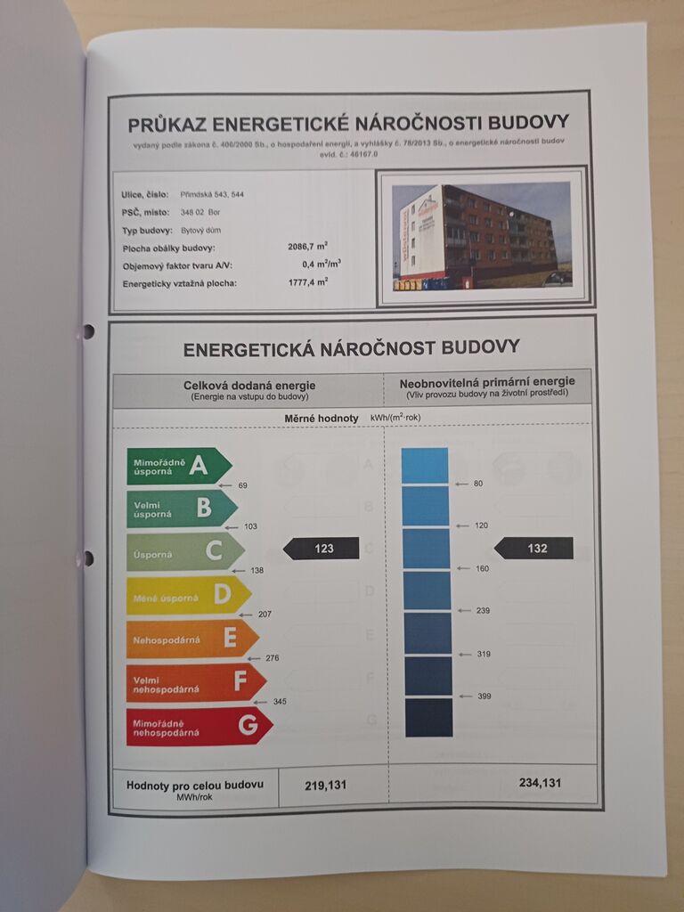 - Ukazatel energetické náročnosti budovy: 123 kWh/m²