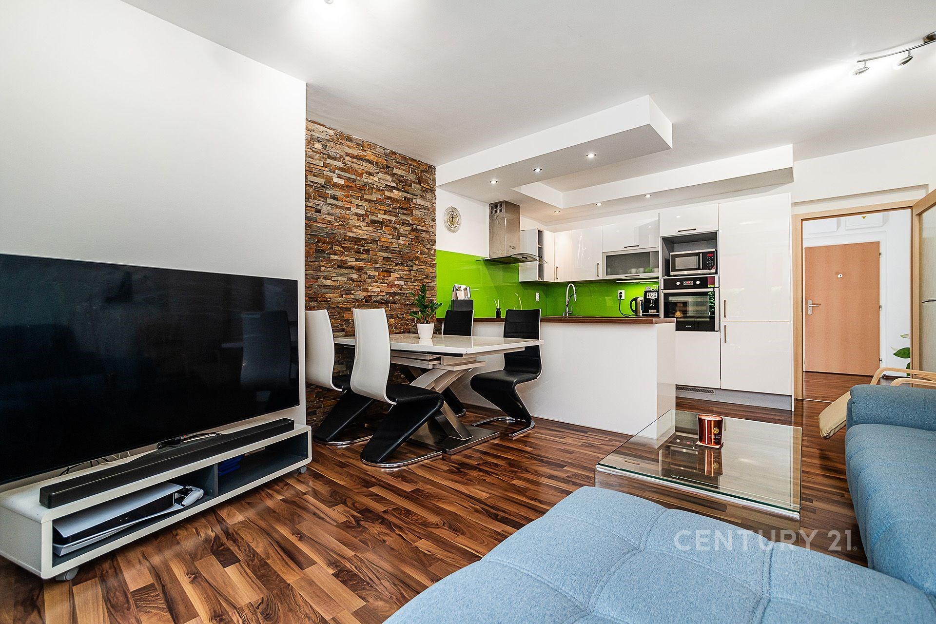 • Obývací pokoj s kuchyňským koutem: Plně vybavená linka (indukce, trouba, myčka, mikrovlnka, lednice s mrazákem). Přímý vstup na slunnou terasu.