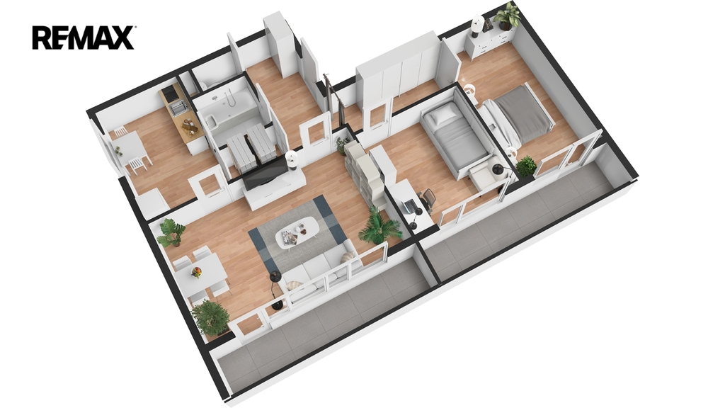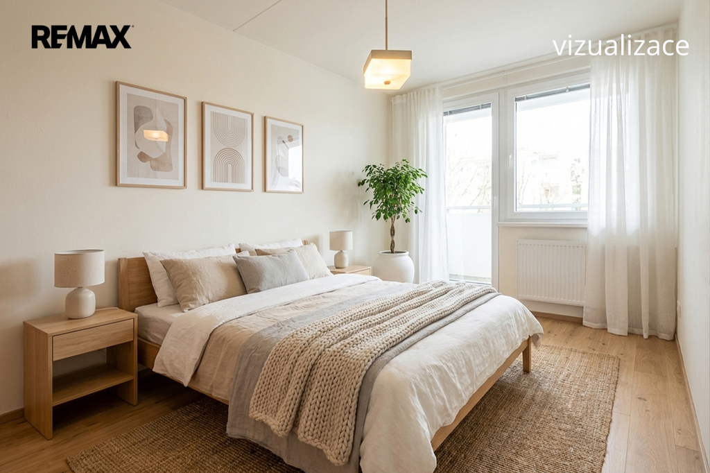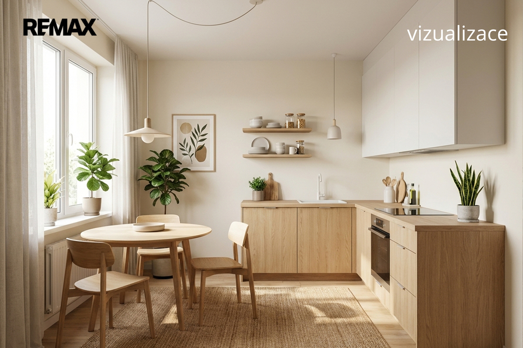 Jednotka je v původním, udržovaném stavu a je obývána prvními majiteli až do současnosti. Byt se nabízí kompletně vybavený starším nábytkem, což umožňuje okamžité užívání nebo postupnou rekonstrukci dle vlastních představ. Velká okna v každé místnosti zajišťují dostatek světla a podtrhují vzdušnost celého prostoru. Pro lepší orientaci a představu jsme nechali zpracovat půdorys a vizualizace možného budoucího stavu interiéru.