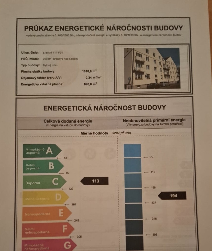 - Ukazatel energetické náročnosti budovy: 113 kWh/m²
