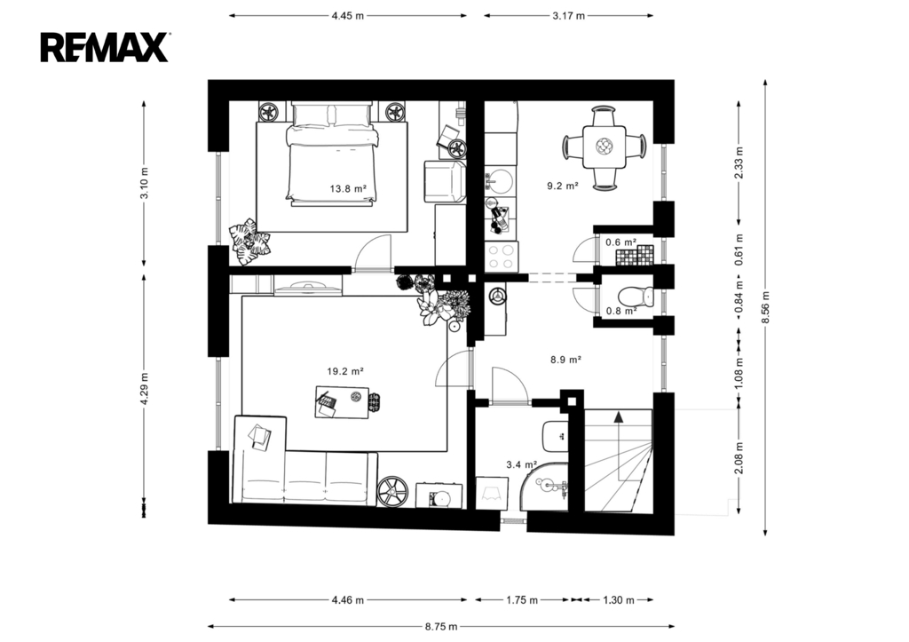 Podlahová plocha domu činí zhruba 150 m² včetně vejminku. Dále jsou zde také dva menší sklepy, garáž o velikosti 28 m² a přístřešek pro auto s plochou 24 m². Nechybí ani dřevěný domek na zahradní náčiní.