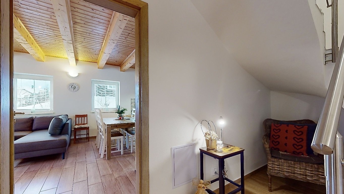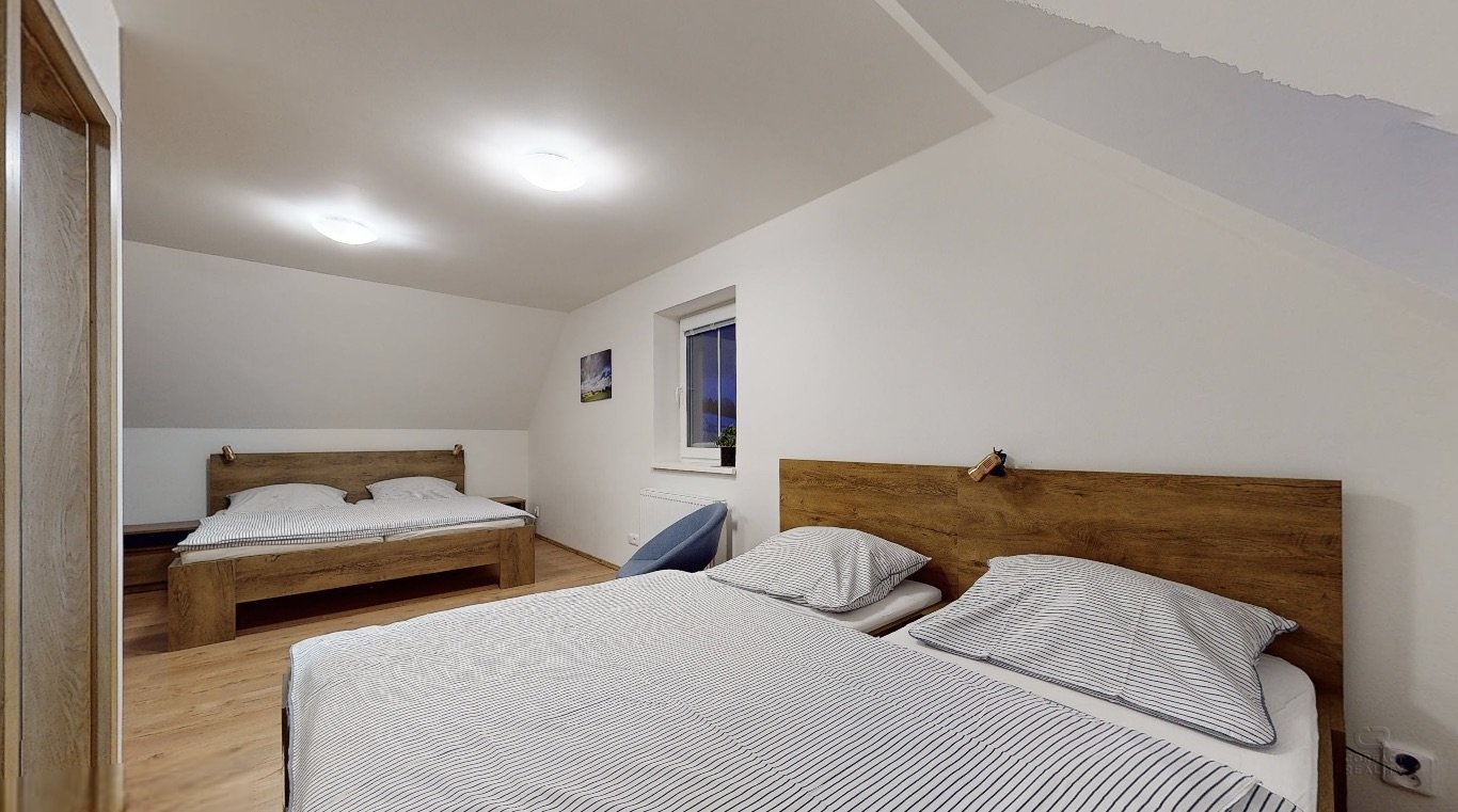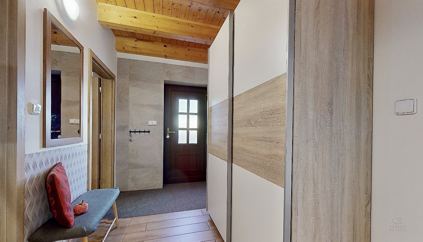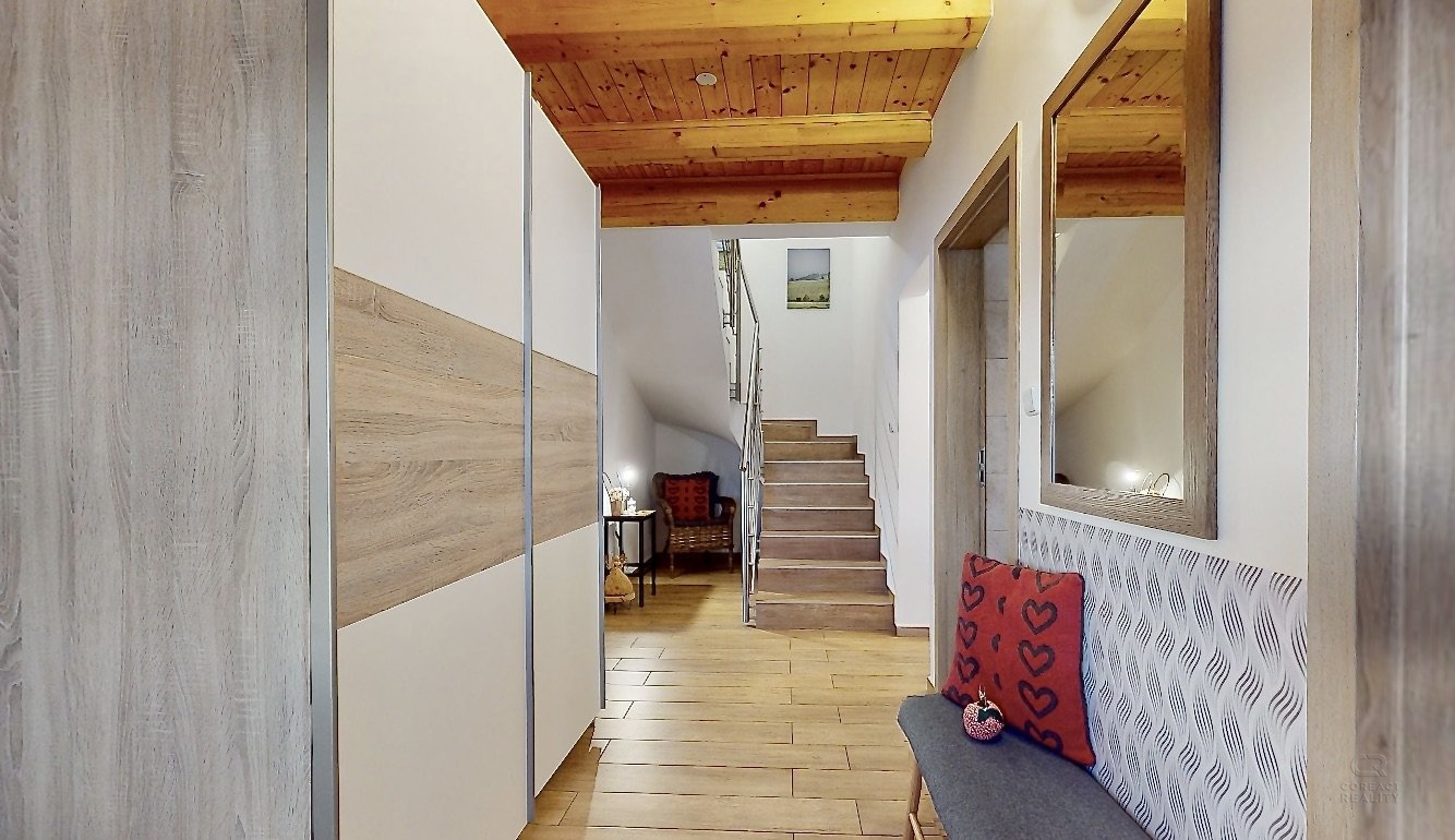 Jedná se o dispozici domu 4+kk ve dvou podlažích, kdy v přízemí se nachází prostorná chodba, lyžárna se šatnou, pokoj pro hosty, velký obývací pokoj s kuchyní, odkud je vidět na sjezdovky, dále prostorná koupelna se sprchovým koutem a pod točeným schodištěm je klidová zóna, kde si můžete přečíst knížku. V patře se nachází dva zrcadlově stejné pokoje a každý z pokojů má navíc svou vlastní koupelnu, což ja opravdu nadstandard pro rodinné bydlení.