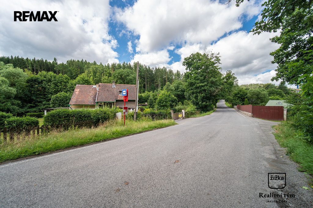 Příjezd na pozemek zajištěn z obslužné cesty podél lesa, kterou využívají ostatní uživatele okolních rekreačních chat - cesta není vhodná pro vjezd těžké techniky.