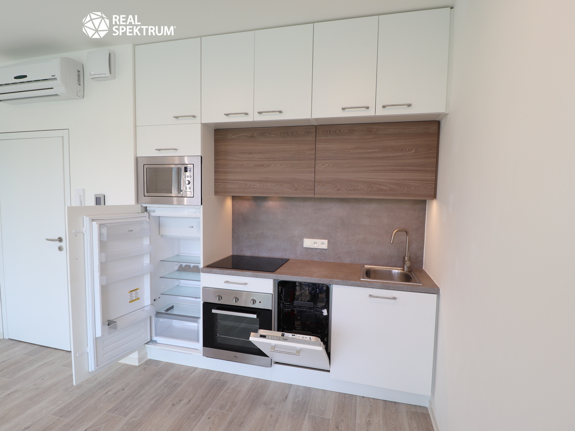 Vybavení: kuchyňská linka vč. spotřebičů (lednice, myčka, mikrovlnná trouba, digestoř, varná deska, trouba), vybavení koupelny a WC (připojení na pračku), bezpečnostní dveře, fan-coil, rekuperace, předokenní elektrické rolety.