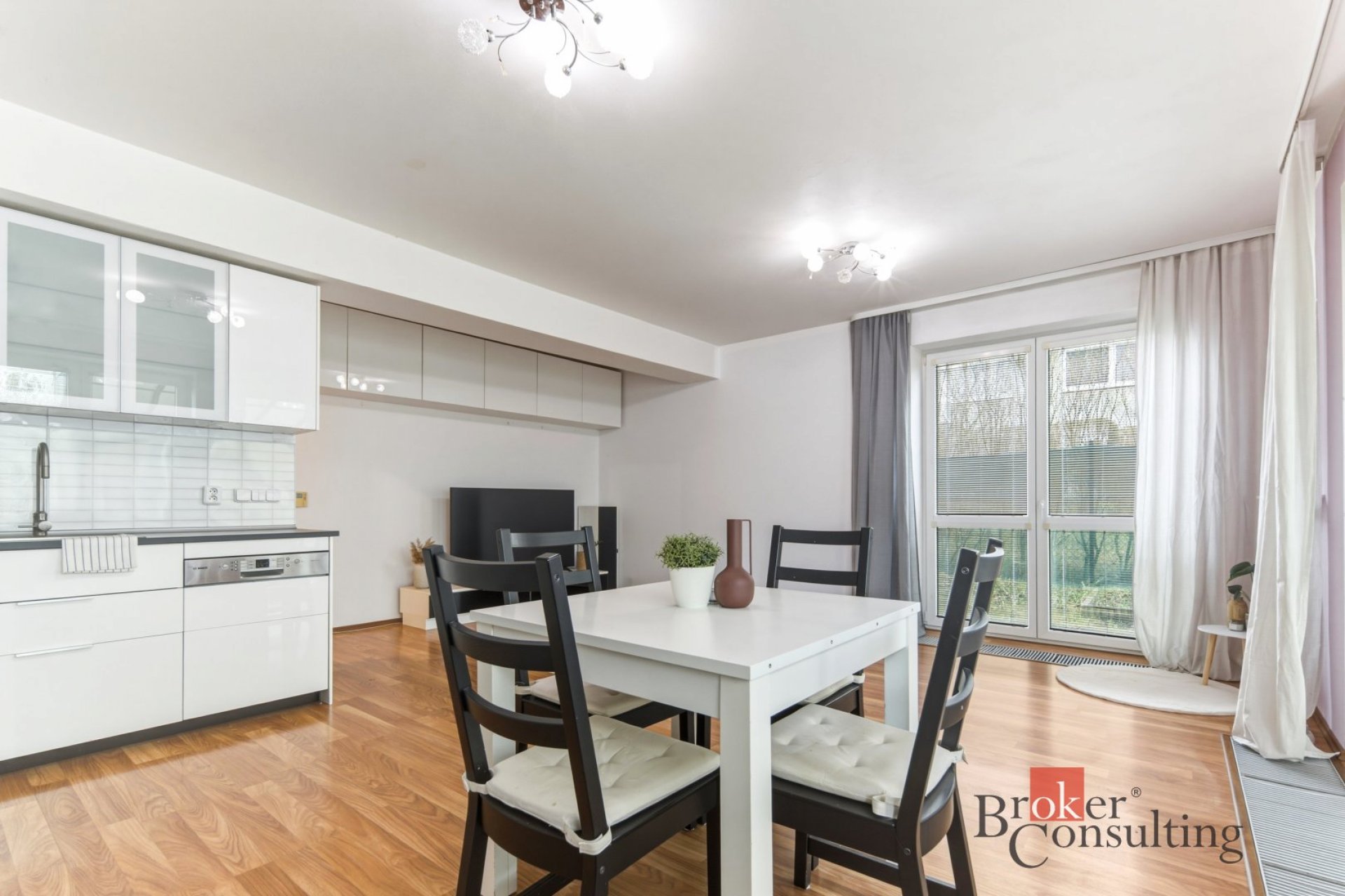Samotný byt má dispozici 3+kk a podlahovou plochu 78,3 m². Dominantou je prostorný obývací pokoj s kuchyňským koutem, odkud vedou francouzská okna přímo na zahradu. Nechybí ložnice, dětský pokoj, koupelna s vanou a dvěma umyvadly ani samostatné WC. Prakticky řešená chodba nabízí dostatek místa pro úložné prostory a k bytu náleží i zděný sklep.