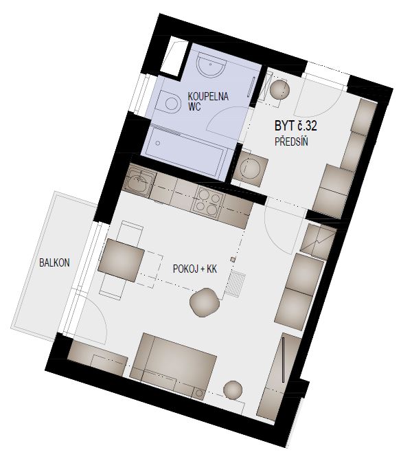 Dispozice: 1+kk, 35,43 m2 + balkon 2,9 m2 + sklep 2,3 m2