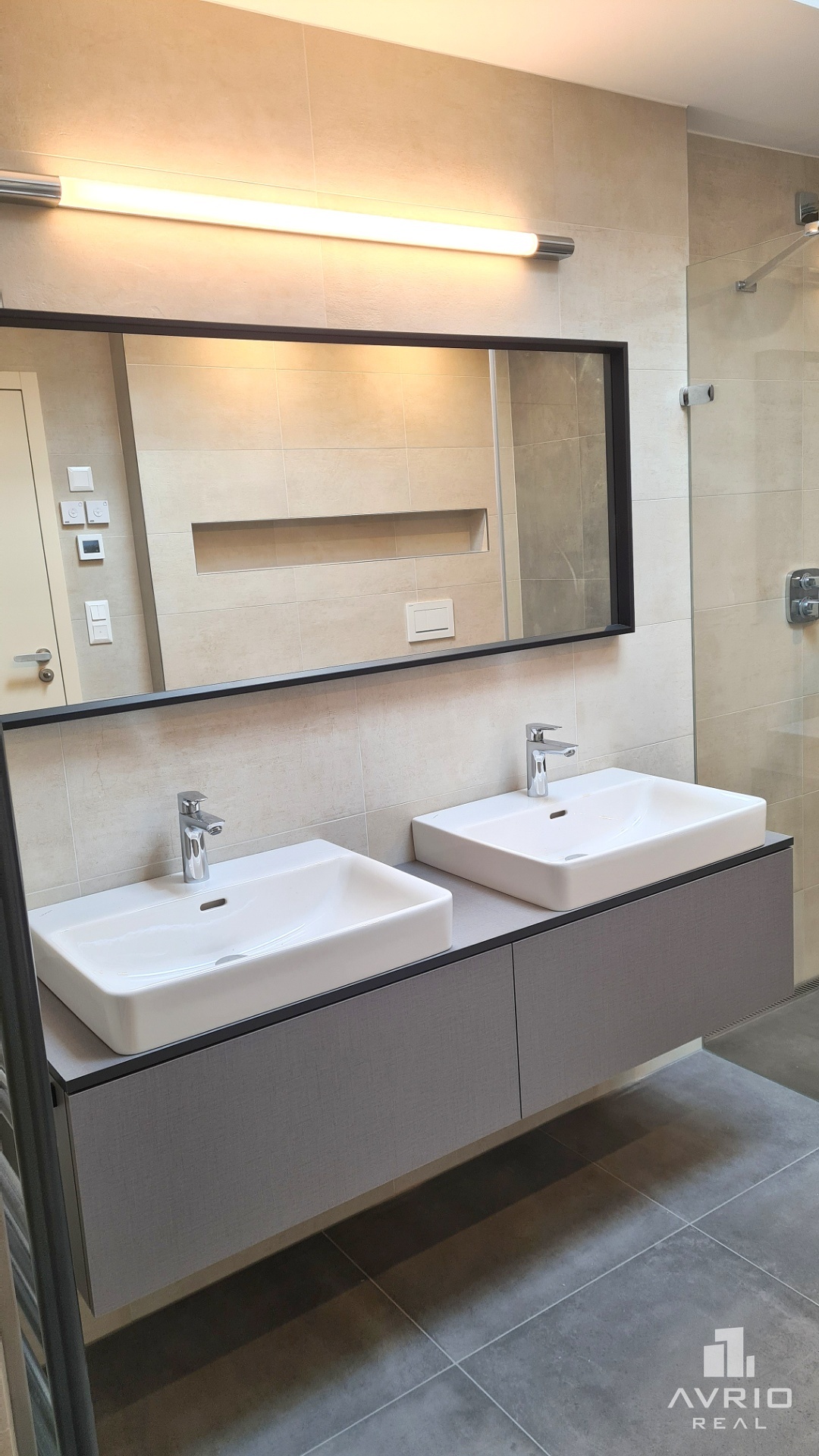 Celková plocha bytu je 106,28 m2, k němu náleží dvě terasy 3,68 m2 a 6,8 m2. Dispozice bytu: kuchyně (oddělena posuvnými dveřmi) 14,42 m2, obývací prostor 39,22 m2, ložnice 12,22 m2, druhá ložnice 13,18 m2, hala 8,24 m2, předsíň 4,30 m2, šatna 2,40 m2, koupelna s WC 8,80 m2, druhé samostatné WC 3,50 m2. Byt se pronajímá jako částečně zařízený - tzn. kuchyňská linka včetně vestavěných spotřebičů tak, jak ji vidíte ve fotogalerii.