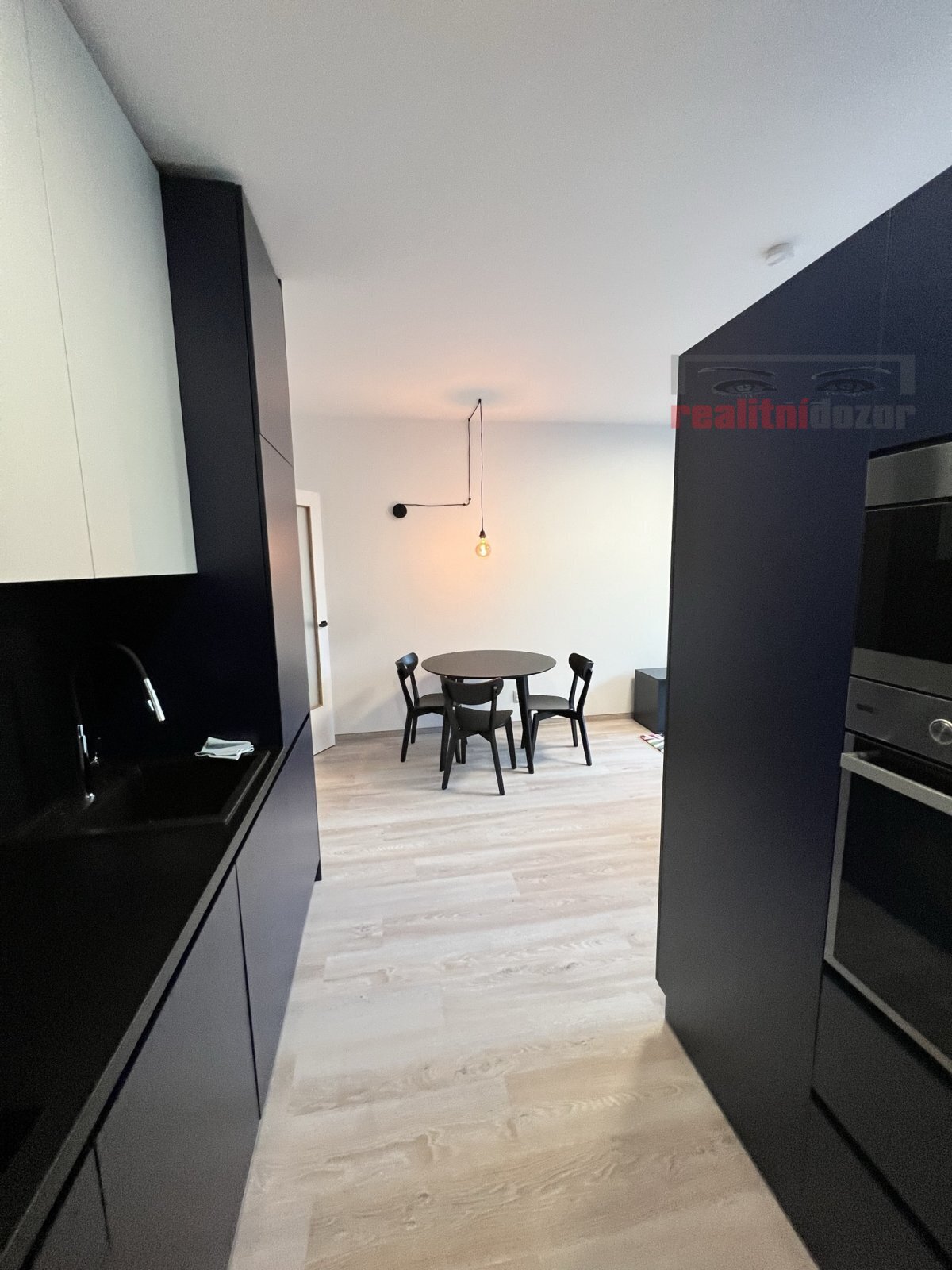 Ob. pokoj je kompletně zařízen - pohovka, skříňka pod TV, dvoulůžko (bez matrací), designová kuchyně vč. spotřebičů, jídelní stůl a židle