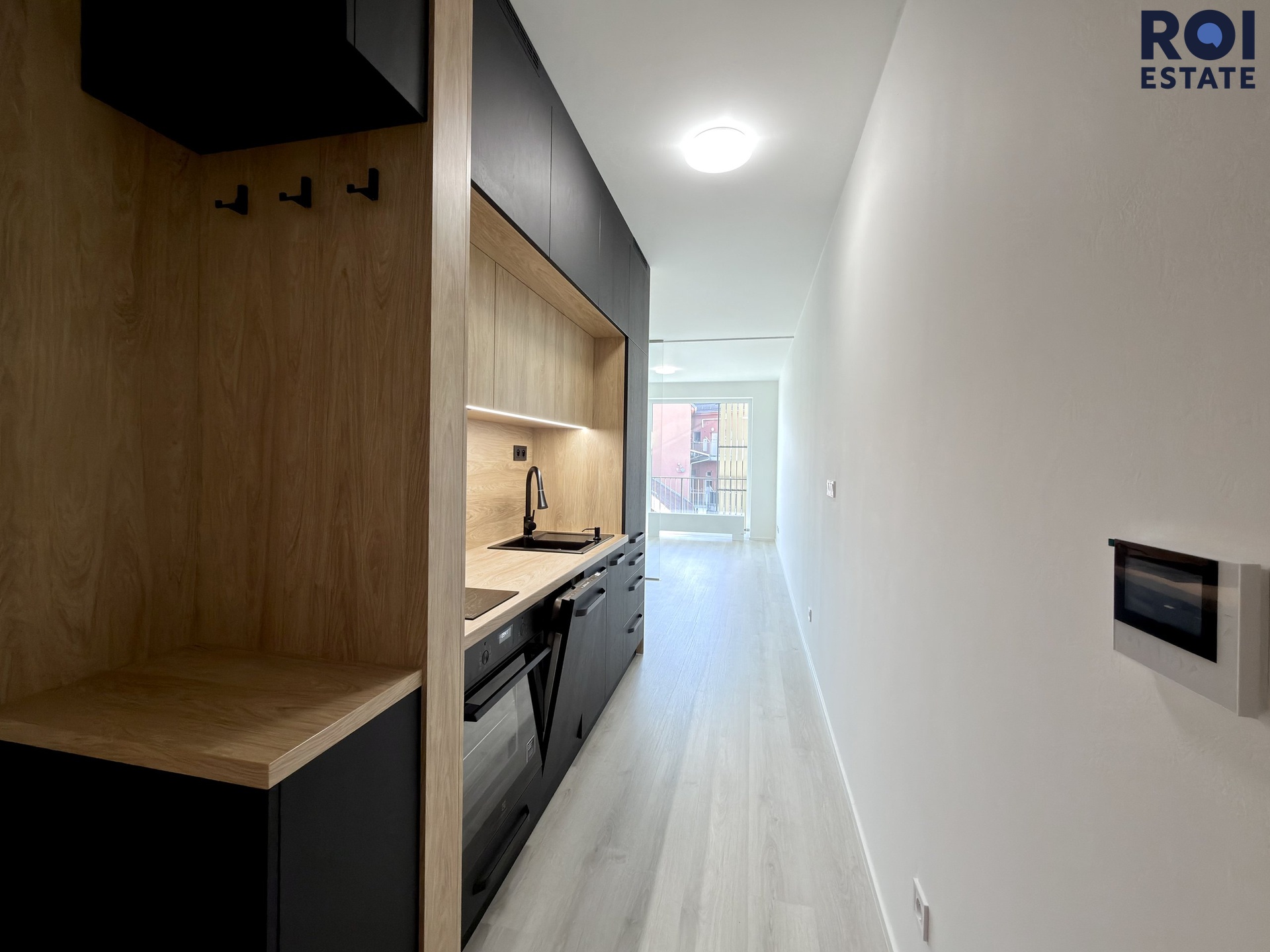 Interiér je moderní a vzdušný. Obytný prostor je chytře rozdělen elegantní skleněnou stěnou, která dodává bytu styl a zároveň zachovává dostatek světla. Kuchyňská linka je vyrobena na míru, je plně vybavena vestavěnými spotřebiči značky Electrolux ( trouba, indukční varná deska, digestoř, myčka), takže se můžete ihned.