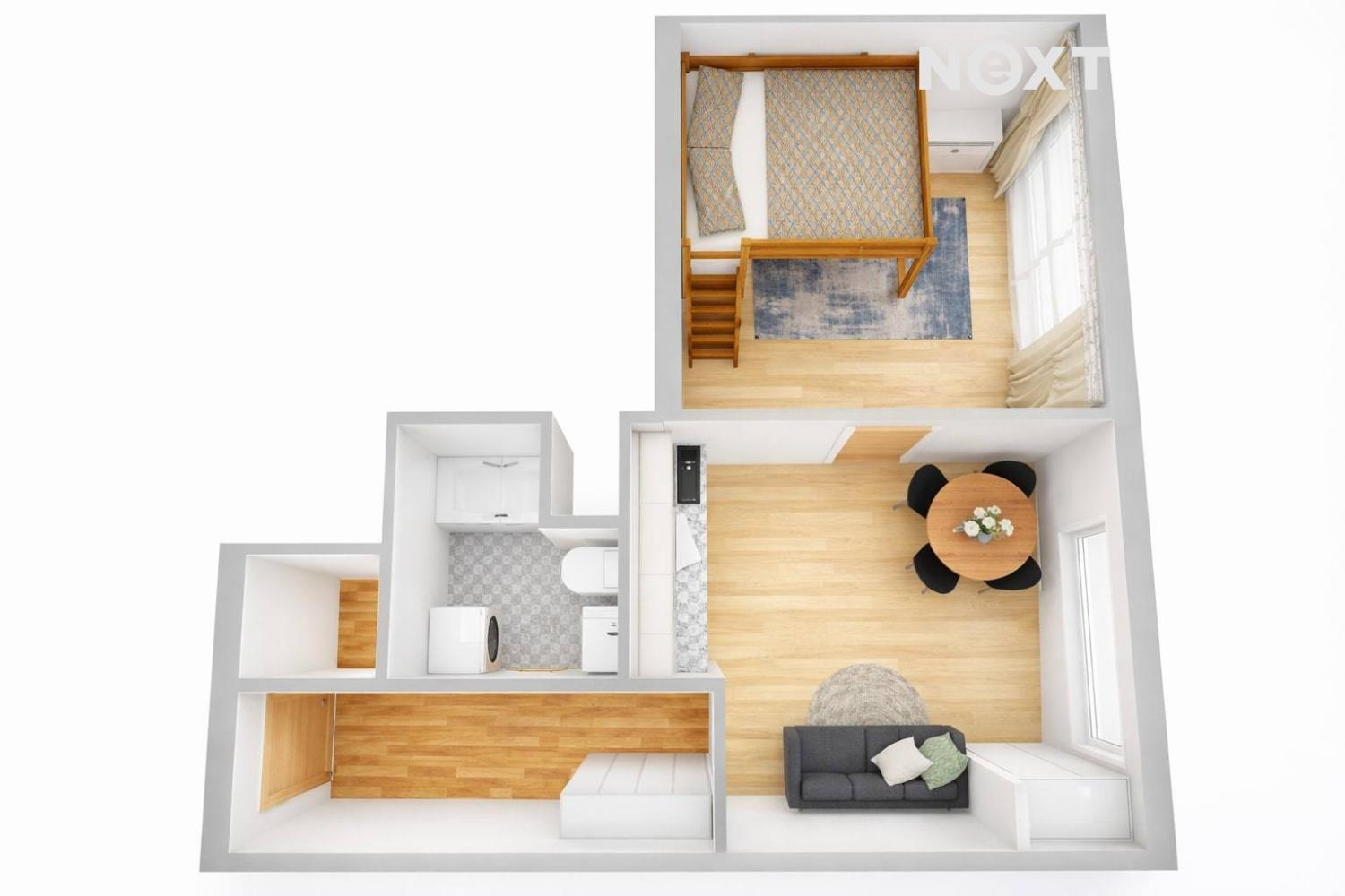 Byt má užitnou plochu přibližně 34 m² a působí velmi praktickým a promyšleným dojmem. Dispozice zahrnuje vstupní chodbu, komoru, koupelnu s toaletou, kuchyni doplněnou o vestavěnou spíž a obytný pokoj se spacím patrem.