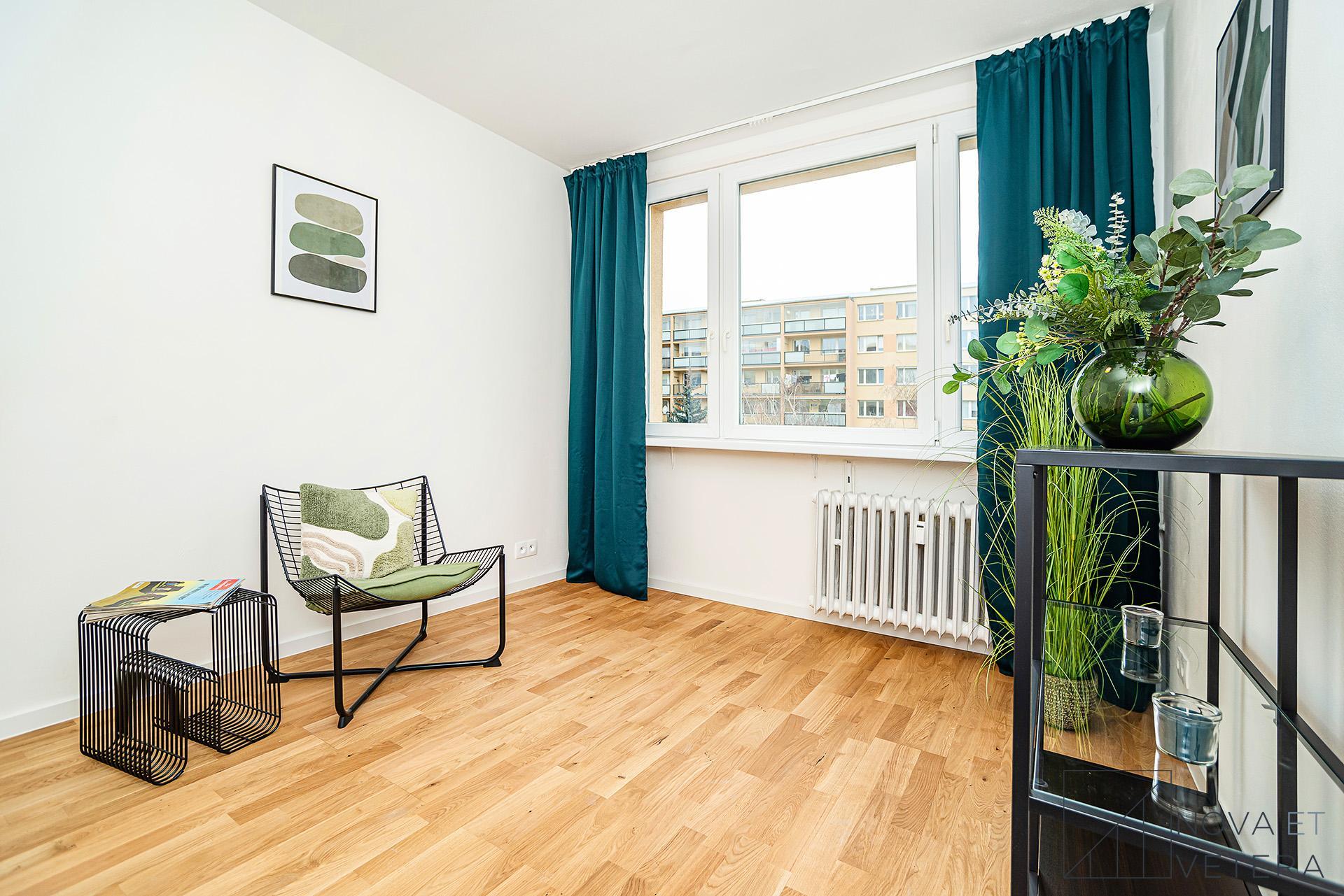 Dispozice bytu nabízí prostorný obývací pokoj s kuchyňským koutem a vstupem na balkón. Dále jsou k dispozici čtyři samostatné pokoje, které lze využít jako ložnici, dětské pokoje nebo pracovnu. Byt disponuje koupelnou se sprchovým koutem a samostatnou toaletou. Součástí je také technická místnost a prostorná vstupní chodba s dostatkem úložného prostoru.