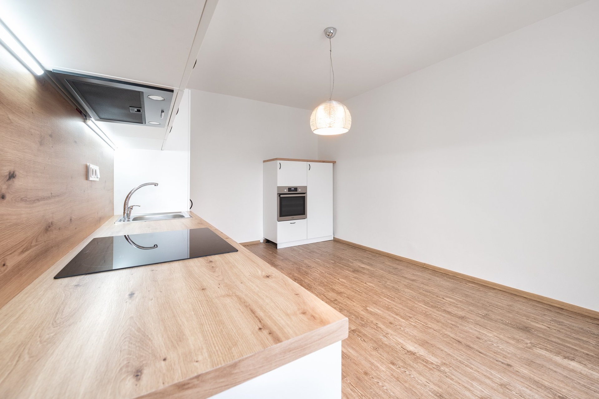 Kuchyňská linka je v obývacím pokoji umístěna na dvou stěnách tak, aby zůstal dostatek místa pro jídelní kout a sedací soupravu. Linka je vybavena moderními spotřebiči (myčka, elektrická trouba, indukční varná deska). Z obýváku lze projít do menší ložnice, z níž je výstup na malý balkonek (francouzský balkon).