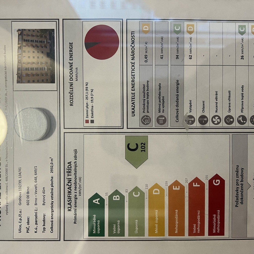 - Ukazatel energetické náročnosti budovy: 102 kWh/m²