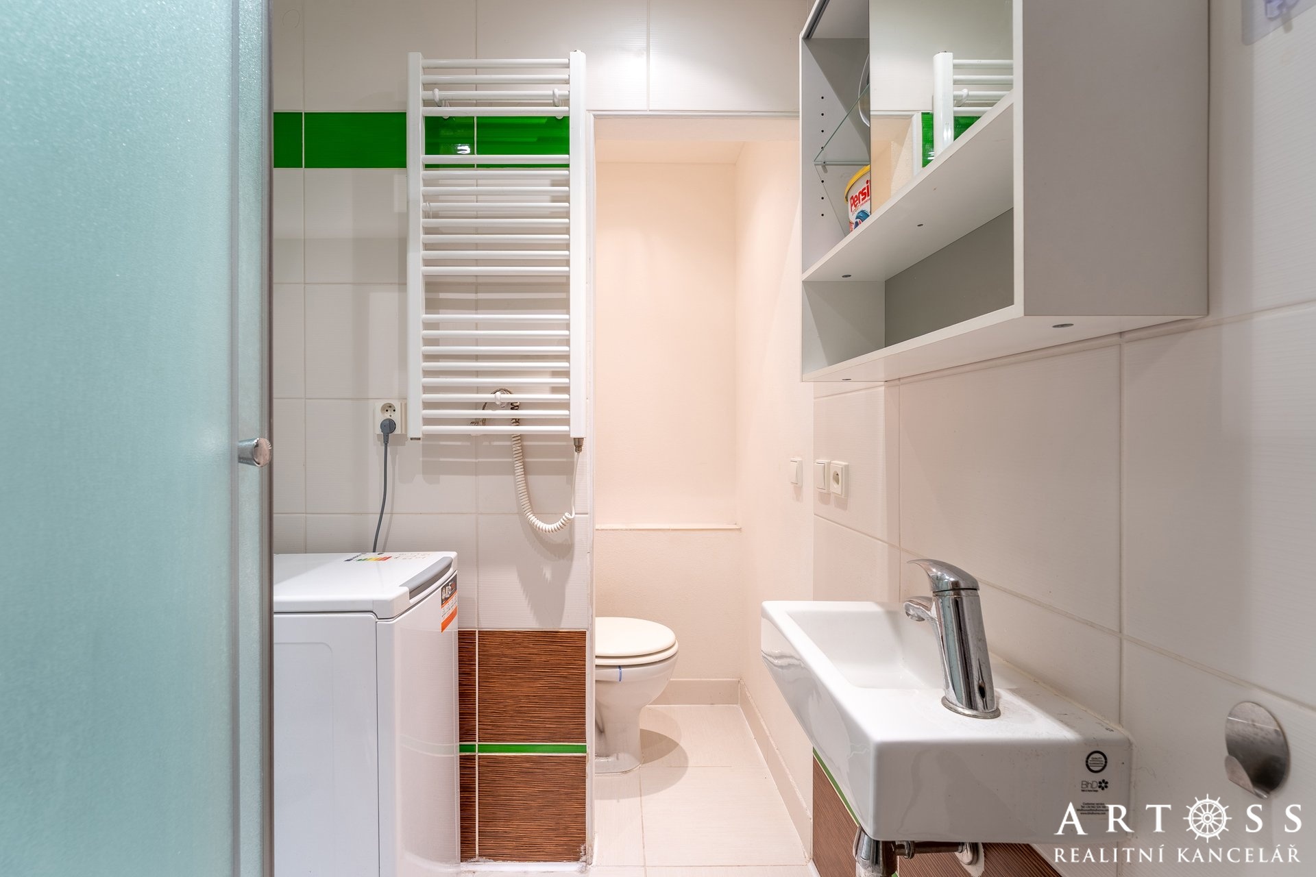 - Koupelna a WC po rekonstrukci - zděné jádro, sprchový kout, WC oddělené přepážkou, umyvadlo i pračka – přesně to, co dnešní nájemník očekává.