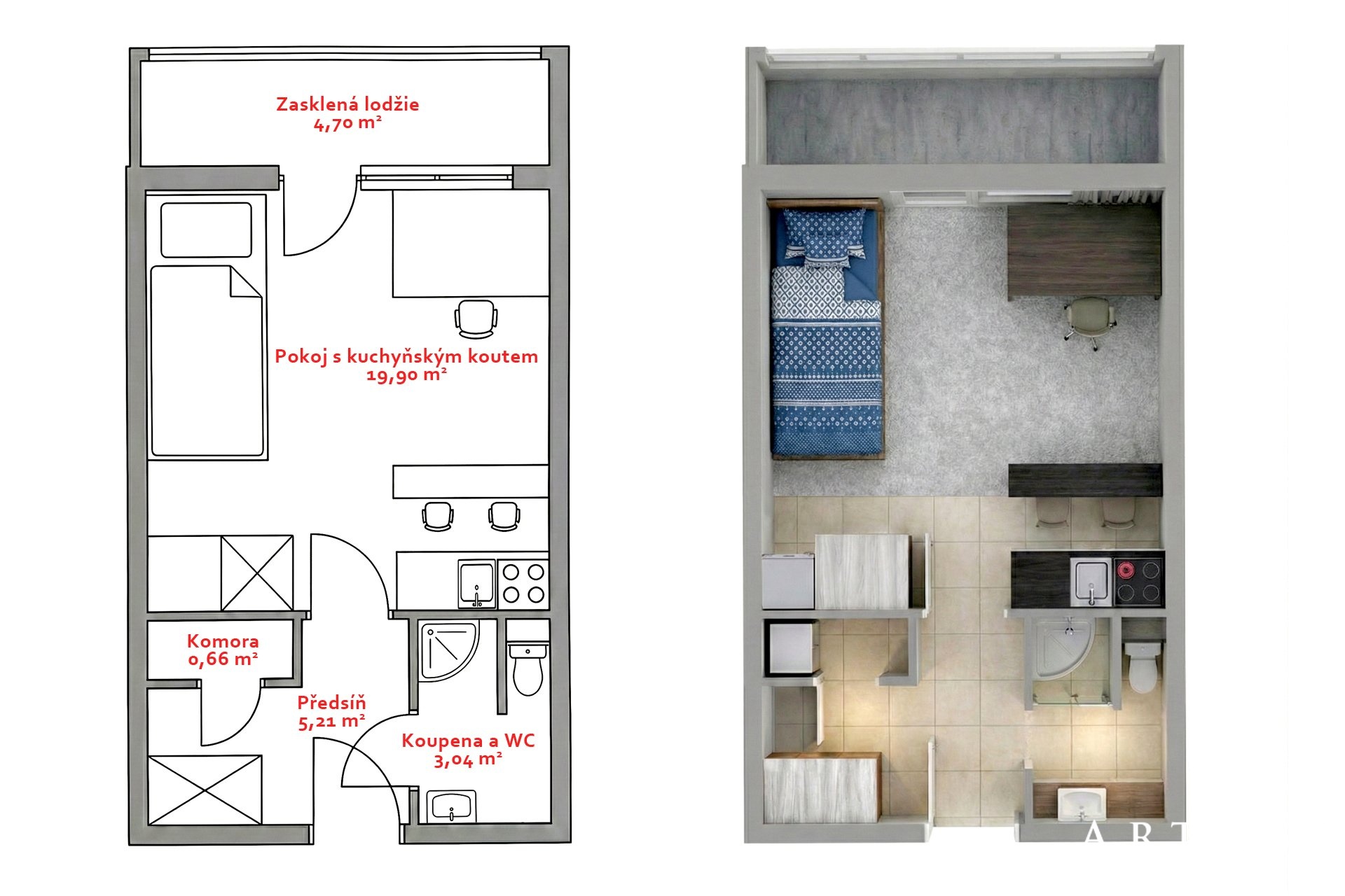 | Dispozice/podlahová plocha: | 1+kk/35 m² |