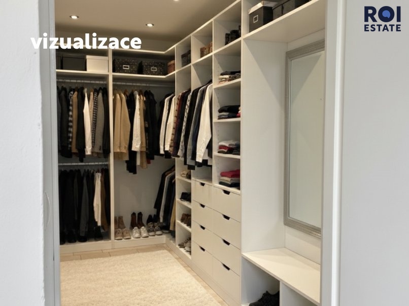 Inteligentním vestavěným nábytkem lze snadno proměnit dispozici na 2,5+kk (pracovna + vstupní předsíň), což zvyšuje atraktivitu pro rodinné bydlení i budoucí pronájem či další prodejní potenciál.