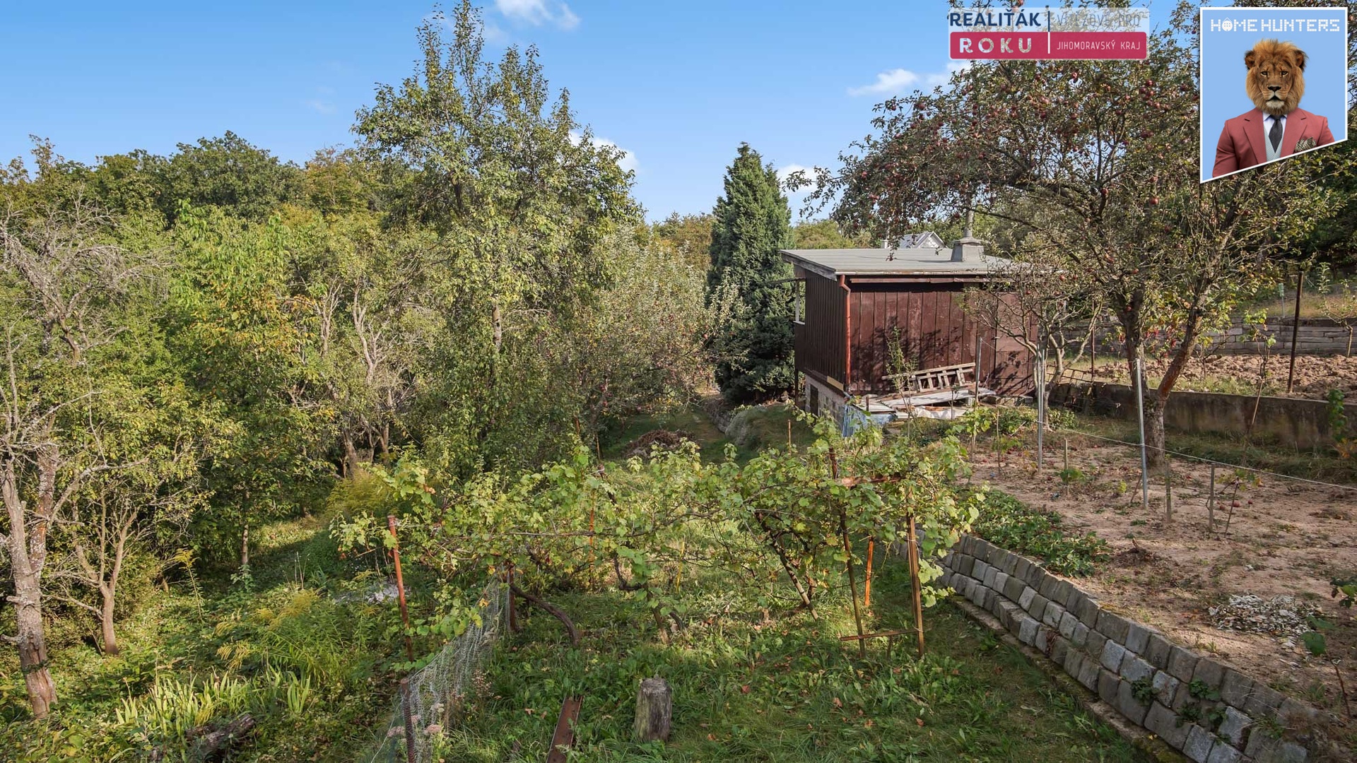 Na pozemku, který je travnatý a ve velmi mírném svahu, rostou ovocné stromy a navíc je zde spousta místa na založení záhonů – třeba k pěstování rajčat, salátů či jakýkoliv dalších plodin.