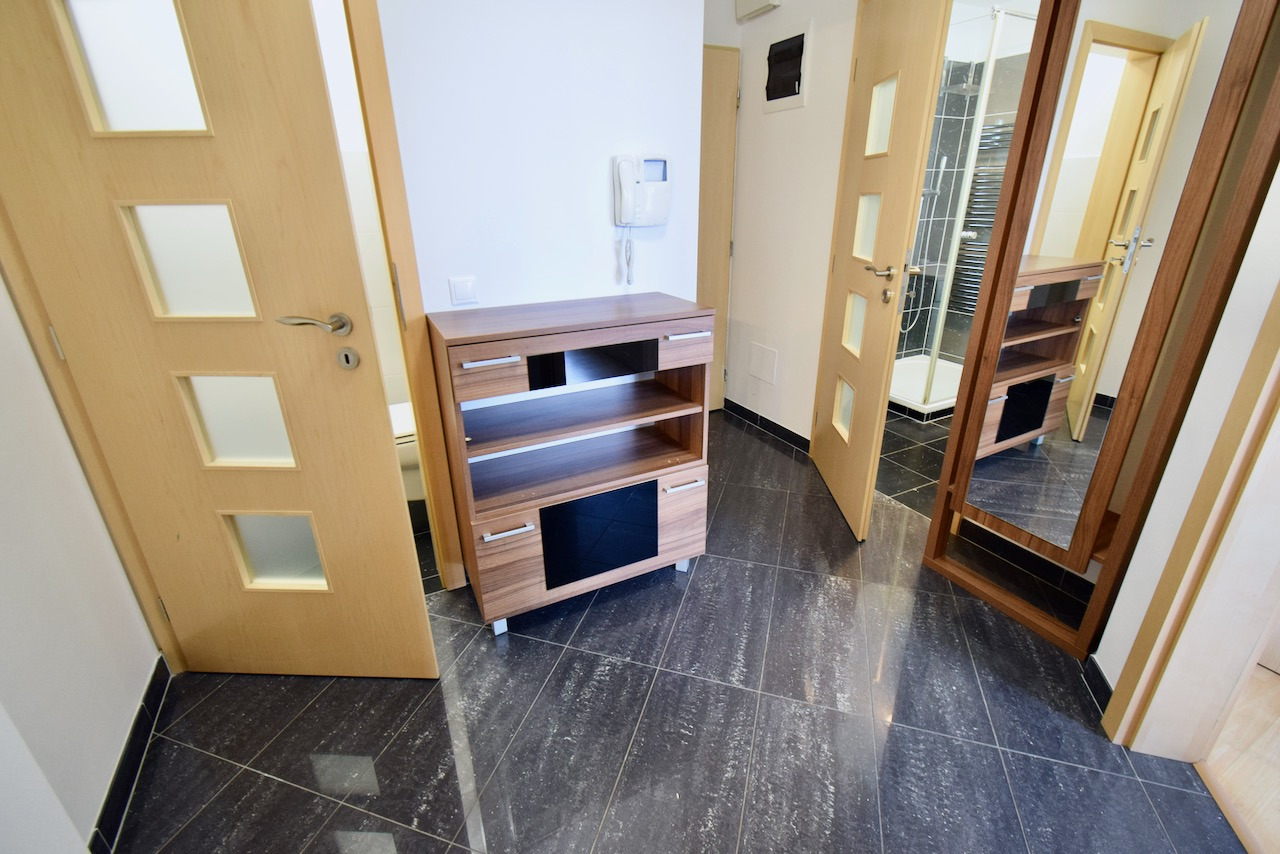 Byt se nabízí plně vybavený. Moderní kuchyňská linka je vybavena elektrickou troubou, mikrovlnnou troubou, sklo-keramickou indukční deskou, digestoří, myčkou a vestavěnou lednicí. Obývací část je zařízena gaučem, konferenčním stolkem, obývací stěnou a televizí. V pokoji se nachází manželská postel, noční stolky a vestavěná skříň. V krásné koupelně je umyvadlo se zrcadlem, sprchový kout a pračka. Toaleta je zvlášť.
