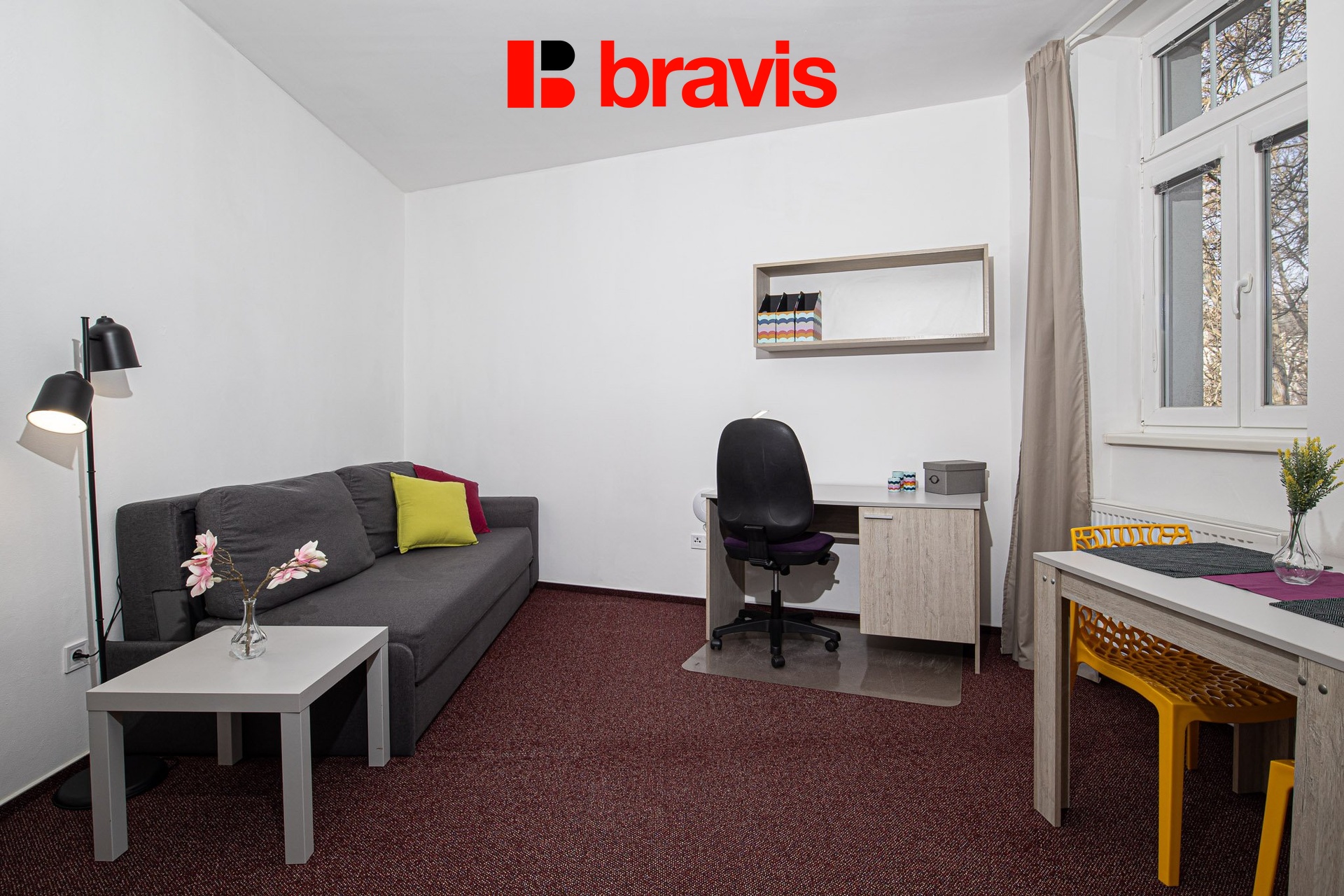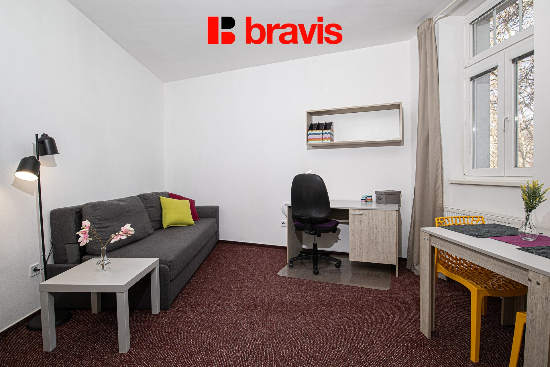 Rozkládací pohovka, pracovní stůl s kontejnerem a kancelářskou židlí, jídelní stůl, 2x jídelní židle, police, šatní skříň, konferenční stolek, komoda s kontejnery, obraz, stolní lampa, závěsy, žaluzie, sítě proti hmyzu.
