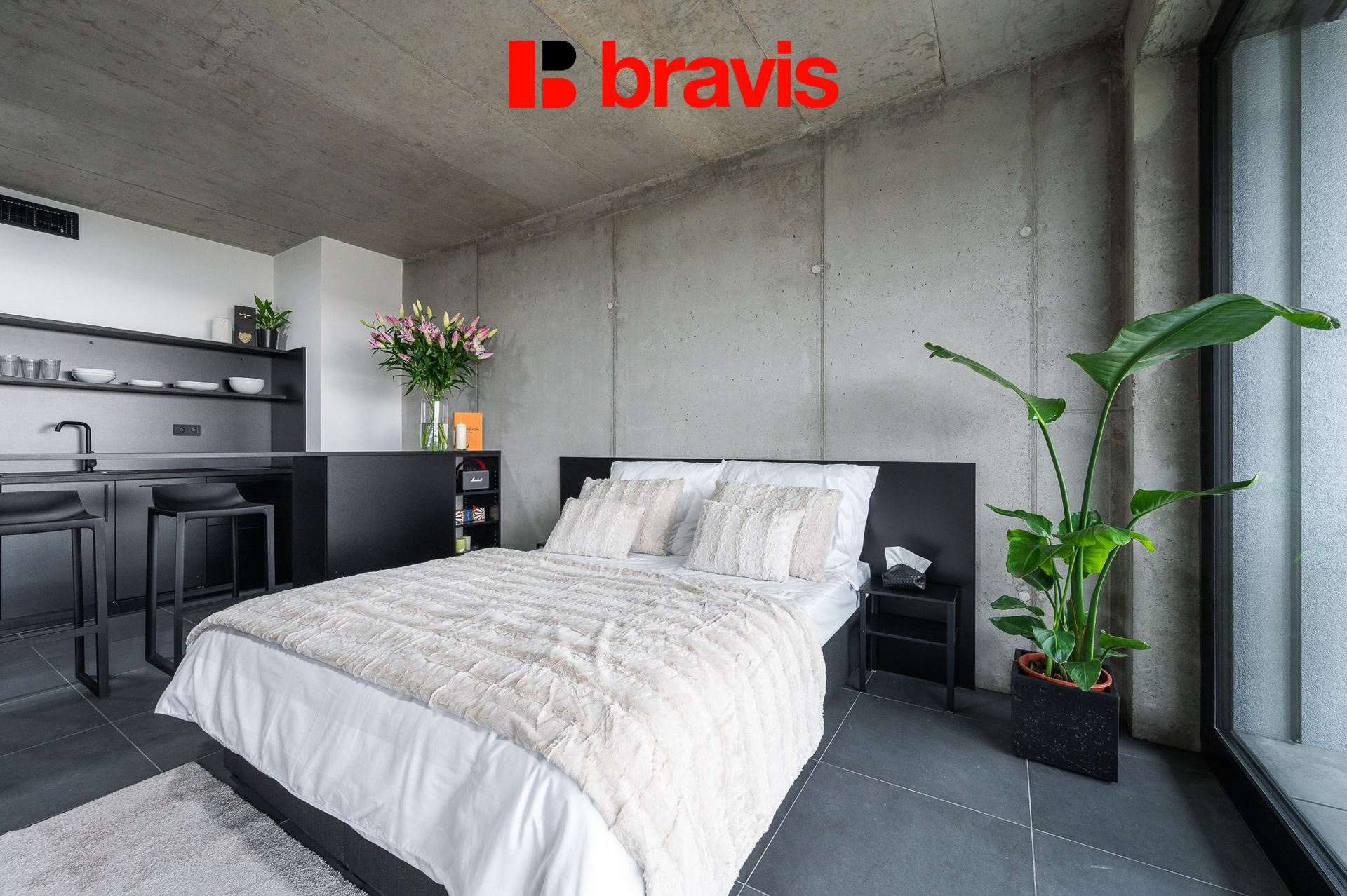 • Obytná část: Dominantou prostoru je ikonické křeslo Barcelona. Pro vaši práci i relaxaci je připraven pracovní stůl, šatní skříně s velkým úložným prostorem a barový pult pro ranní kávu. Pohodlná postel (160x200 cm) včetně lůžkovin.