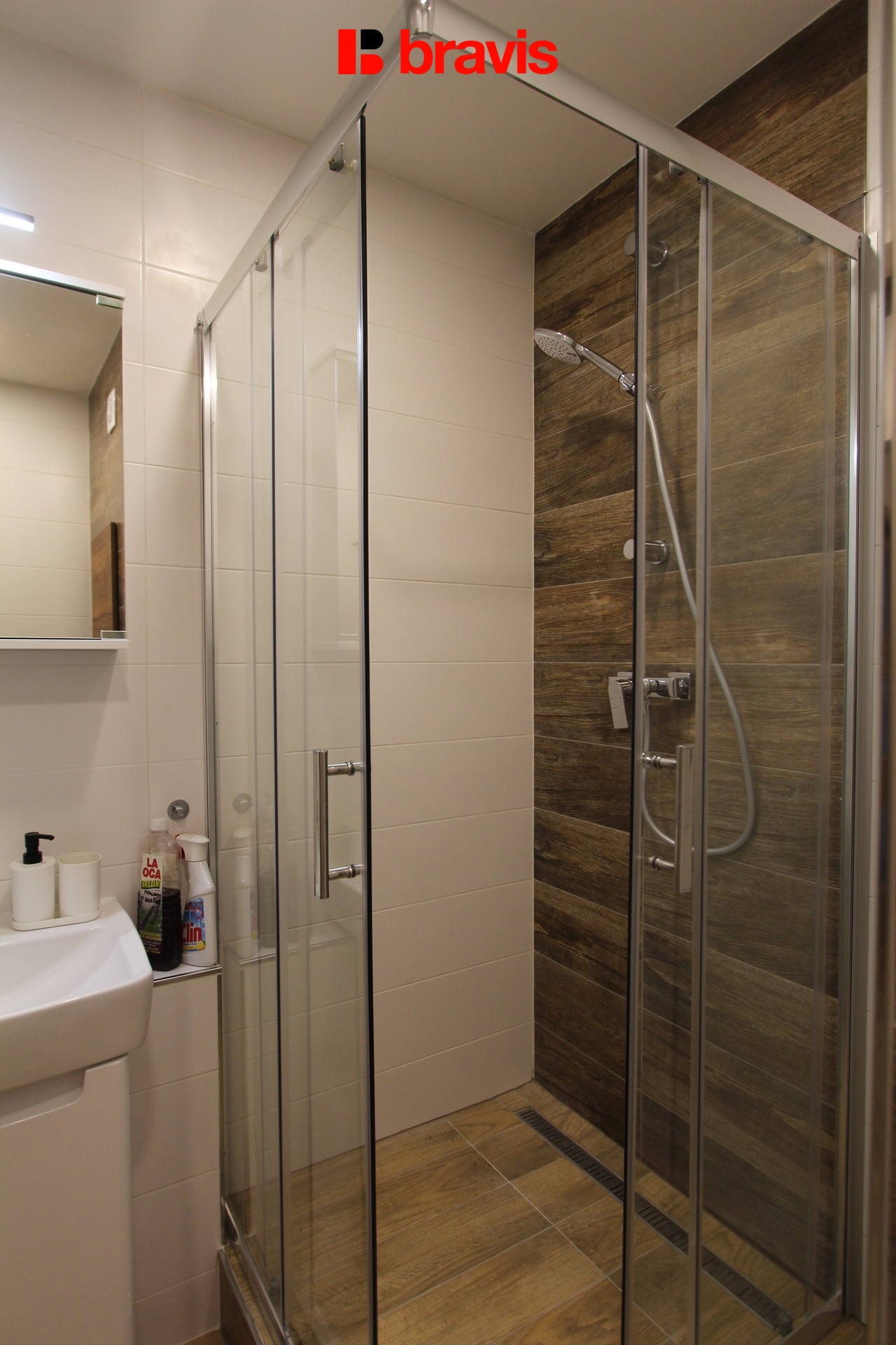 V koupelně je sprchový kout, umyvadlo, toaleta.