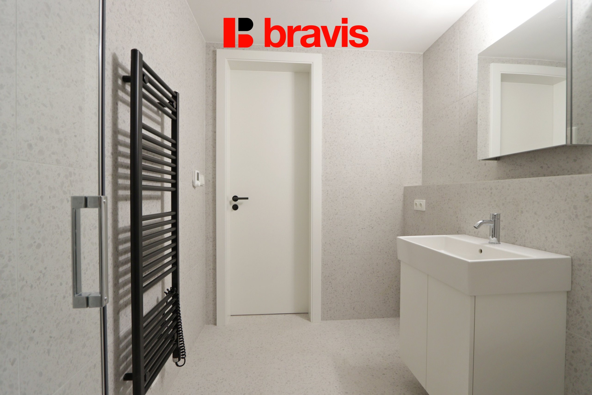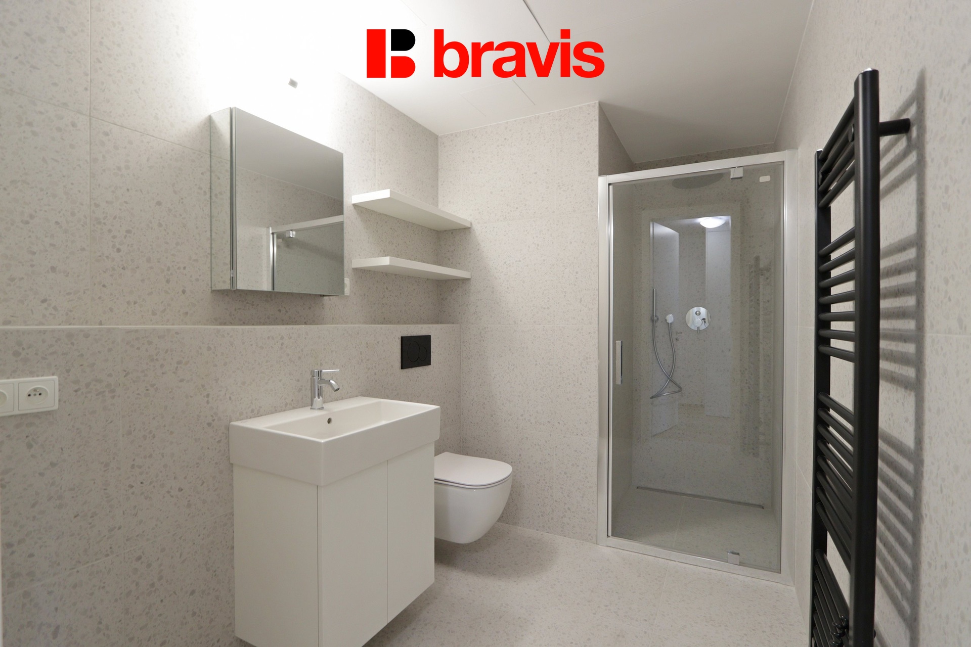 Koupelna disponuje sprchovým koutem, umyvadlem, otopným žebříkem, přípojkou na pračku a toaletou - vše v moderním designu.