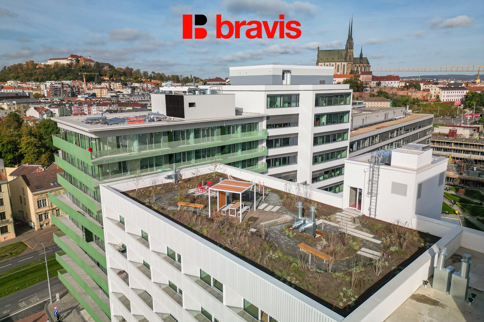 Dům nabízí možnost relaxace na střešní zahradě s nádherným výhledem na celé Brno.