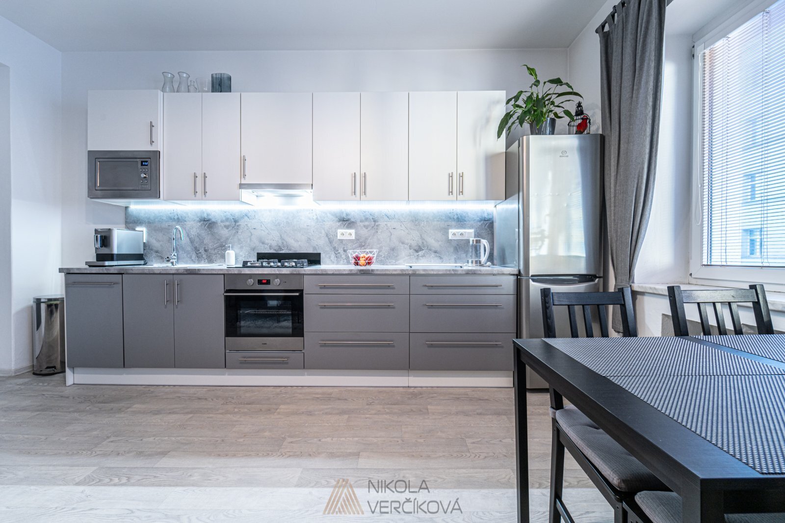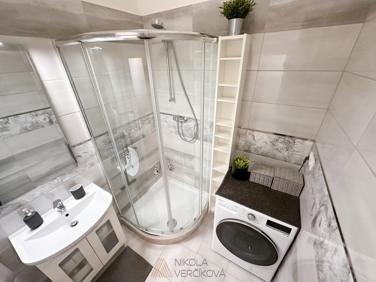 V rámci vybavení je k dispozici - kuchyňská linka včetně všech spotřebičů, jídelní stůl se židlemi, sedací souprava, televize, vestavěné skříně, manželská postel, noční stolky, komoda, sprchový kout a pračka se sušičkou.