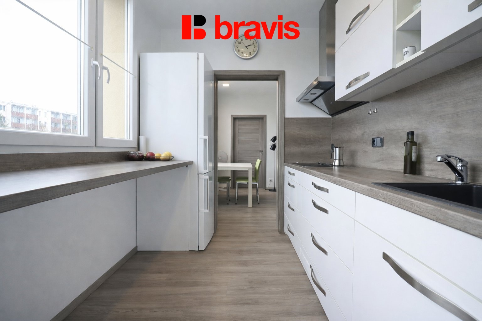 Kuchyň je plně vybavena moderními spotřebiči – k dispozici je lednice s mrazákem, trouba, indukční varná deska, digestoř a myčka. Nabízí také dostatek úložného prostoru i pracovní plochy pro pohodlnou přípravu jídel.