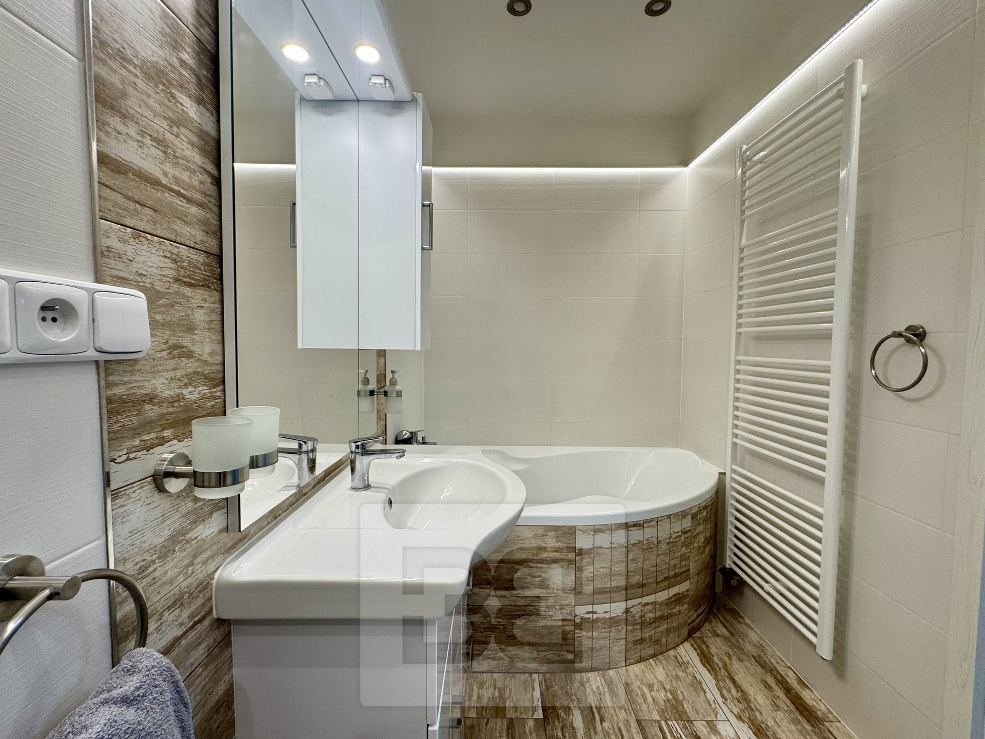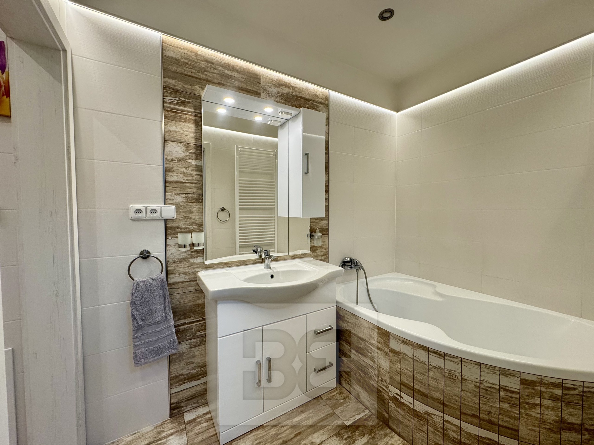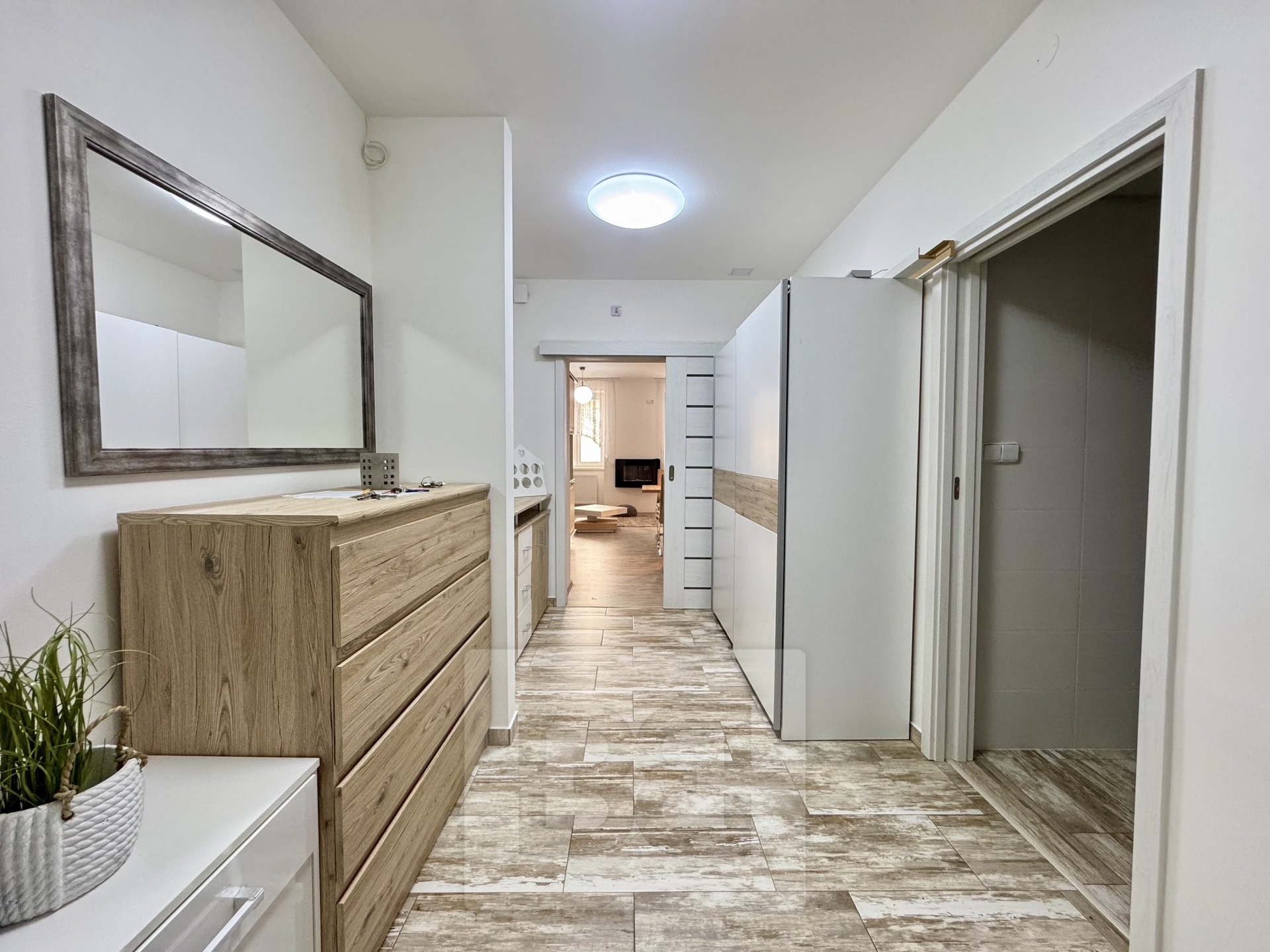 Koupelna s vanou a umyvadlem je průchozí na druhé WC, kde je také umístěna pračka a další úložný prostor. Dále najdete obývací pokoj s rozkládacím gaučem a dalšími úložnými prostory a nakonec ložnici s postelí a skříněmi. Všechny místnosti jsou moderně zařízené.