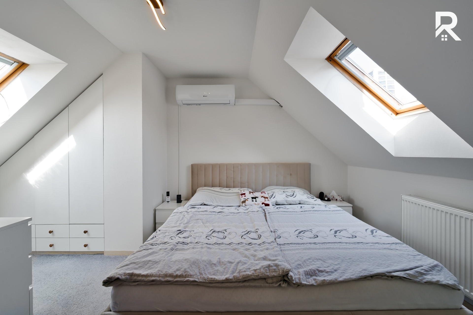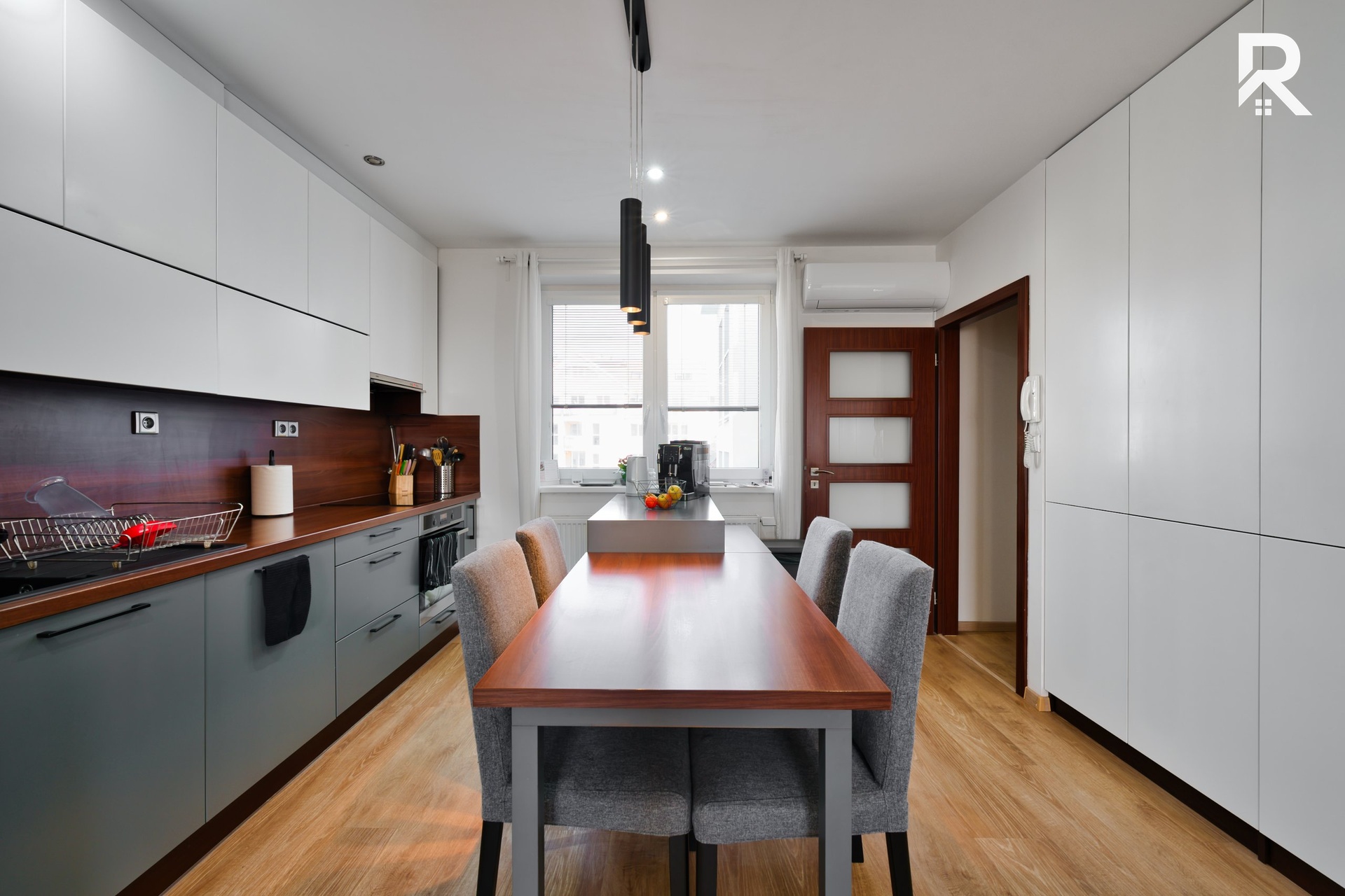 Samotný byt se nachází ve 4. nadzemním podlaží cihlového domu bez výtahu. Už při vstupu Vás přivítá prostorná chodba s dostatkem úložného prostoru v podobě vestavěných skříní, nechybí zde ani pračka a samostatná toaleta. Z chodby se plynule dostanete do dominanty celého bytu – velkorysého obývacího prostoru s kuchyňským koutem, který zaujme nejen svou vzdušností, ale i moderním designem. Kuchyňská linka je plně vybavena všemi spotřebiči, včetně myčky, lednice s mrazákem, trouby, digestoře a indukční varné desky. Obývací část zůstává zařízená – k dispozici je pohodlná sedačka, pracovní kout, TV stěna i televize. Praktickým benefitem je také úložný prostor pod schody, ideální pro uskladnění domácích potřeb či kuchyňského vybavení.
