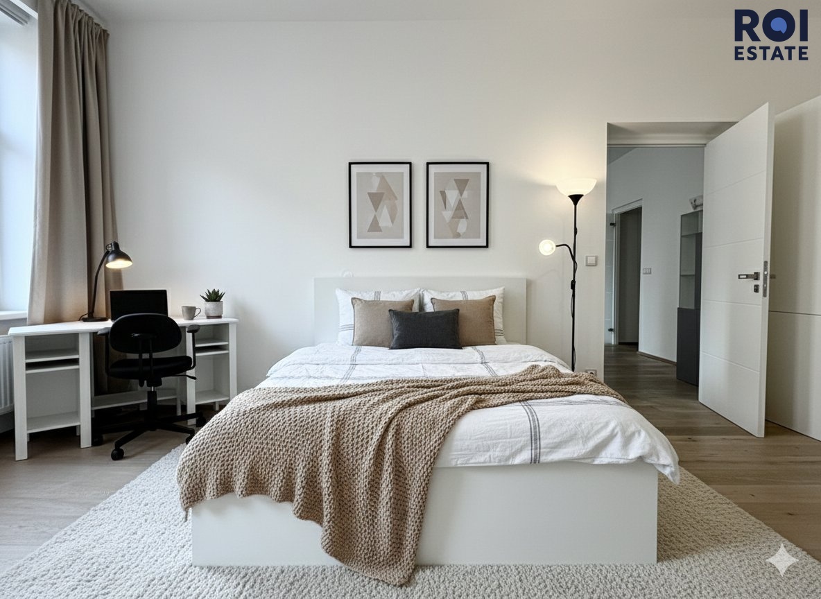 Druhý pokoj do vnitrobloku je prázdný. Třetí pokoj je vybavený postelí, skříněmi i stoly.