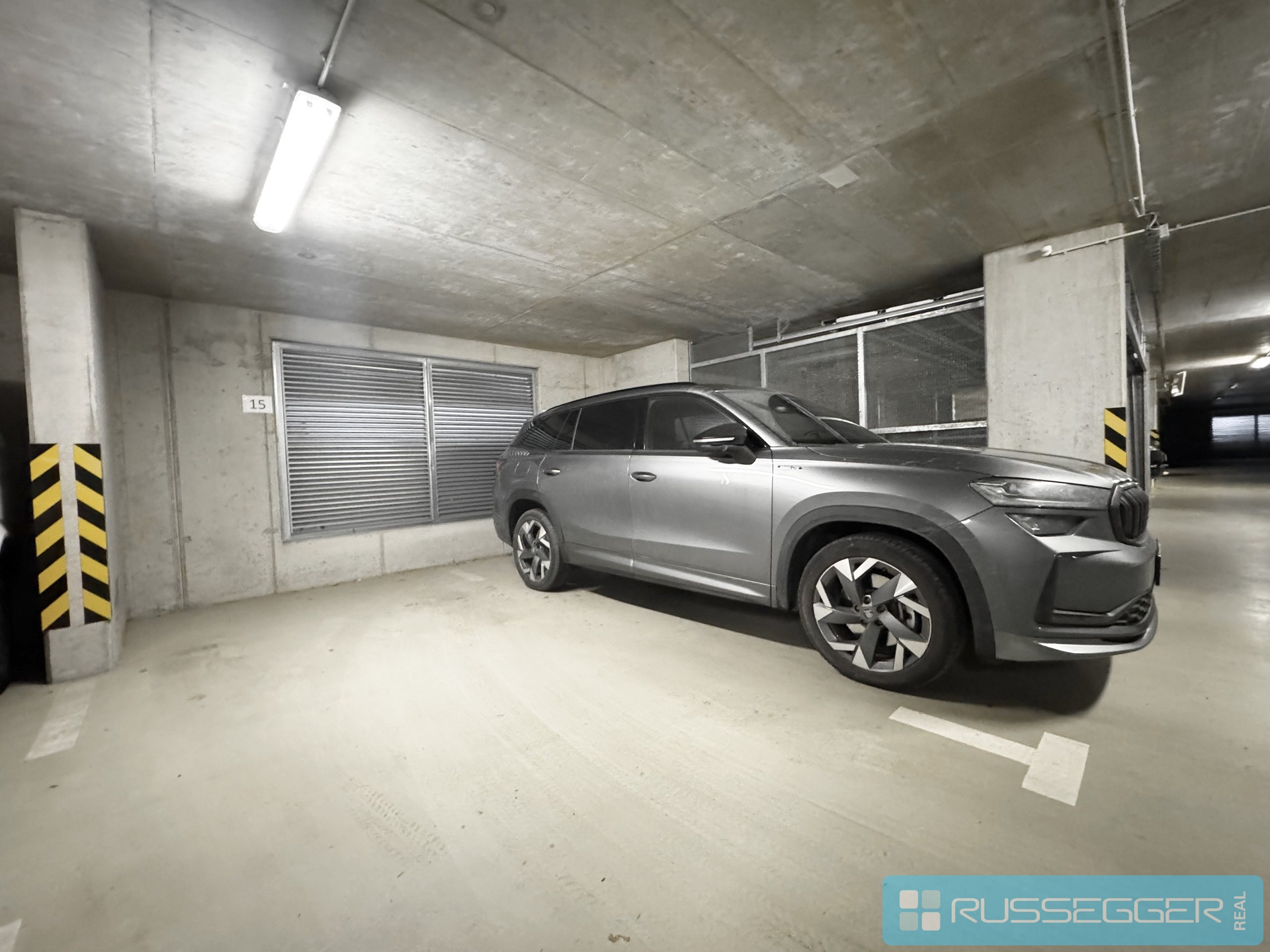 Stání se nachází v 1. podzemním podlaží (1.PP), přístupné standardním sjezdem – nejedná se o zakladač.