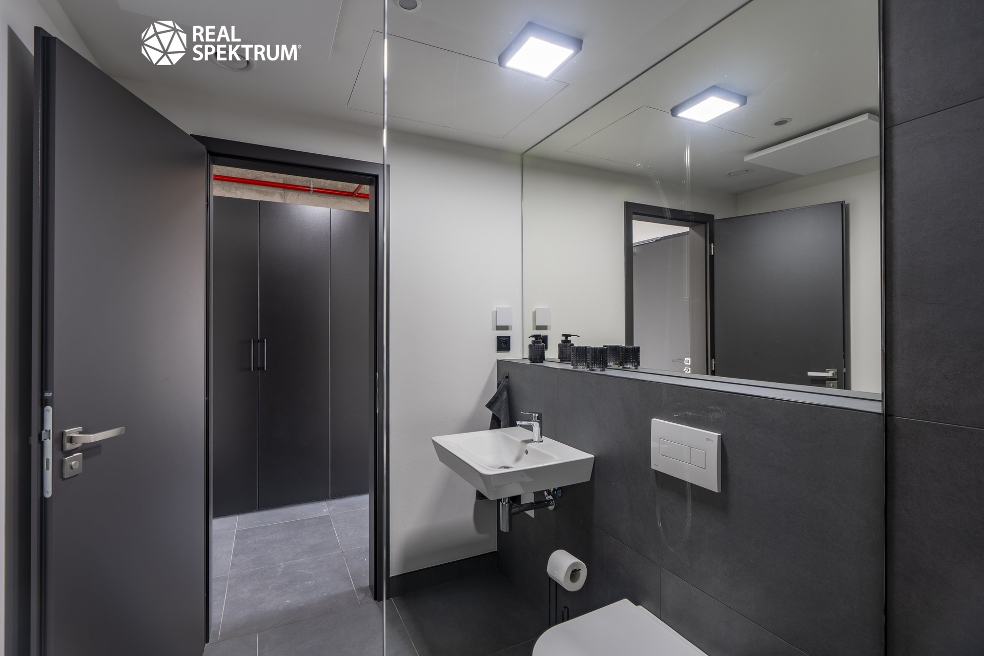 • moderní koupelna se sprchou, umyvadlem a WC