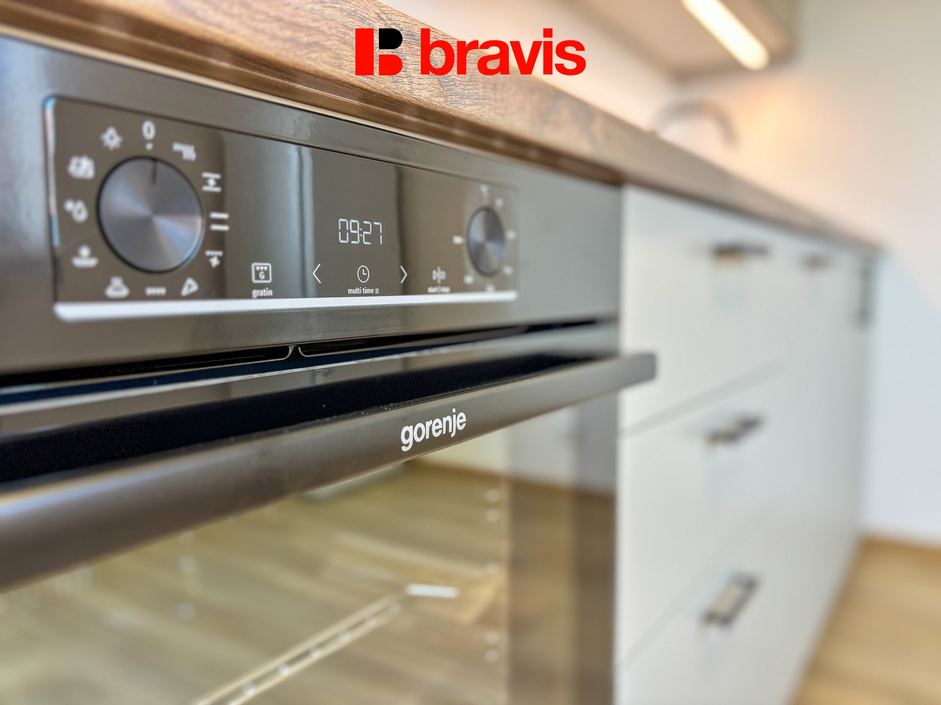 Jedna z největších předností tohoto bytu je zbrusu nová kuchyňská linka zahrnující vše, co pro pohodlné vaření potřebujete - el. troubu, indukční varnou desku, digestoř, myčku a lednici s mrazákem.